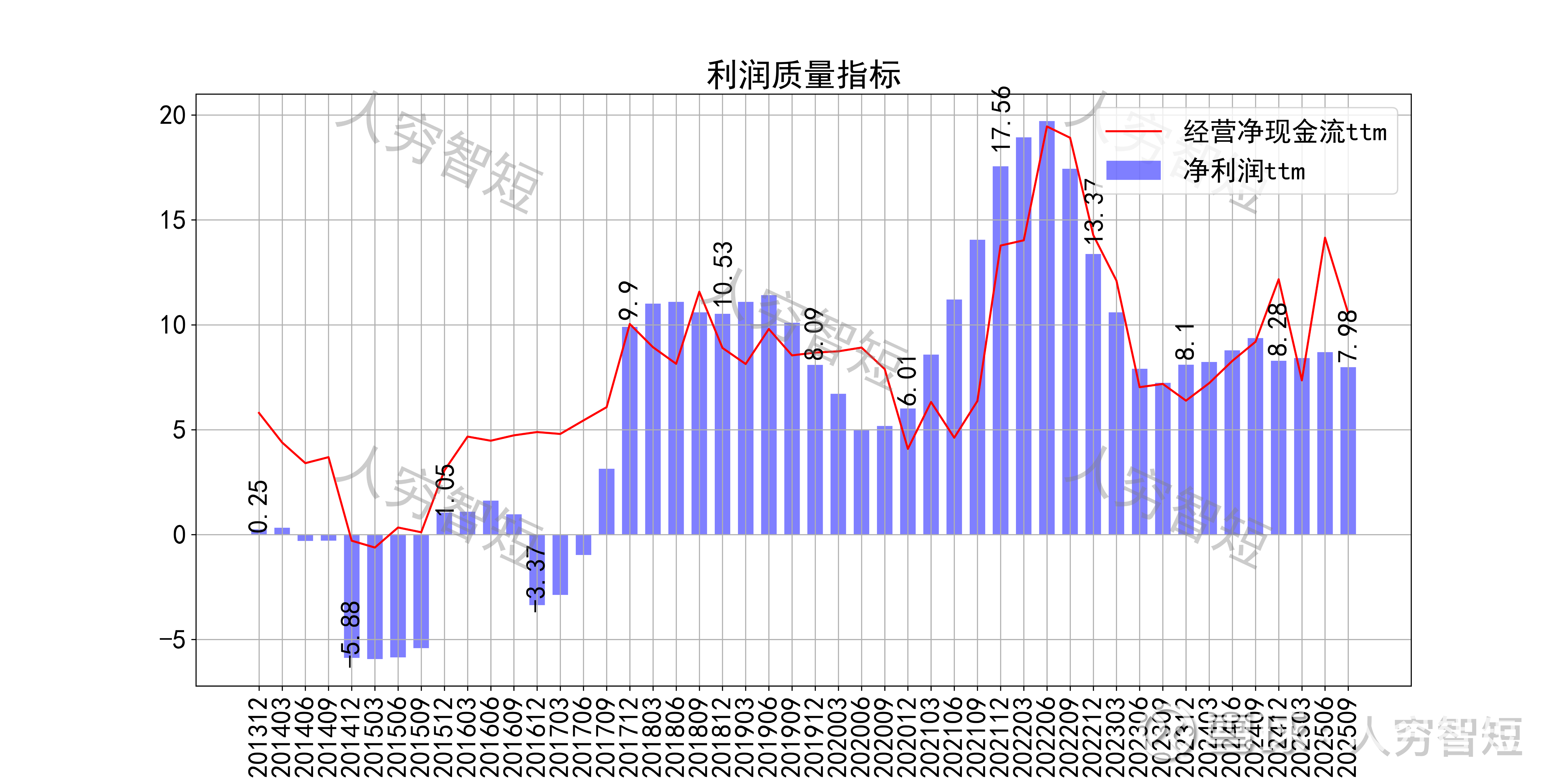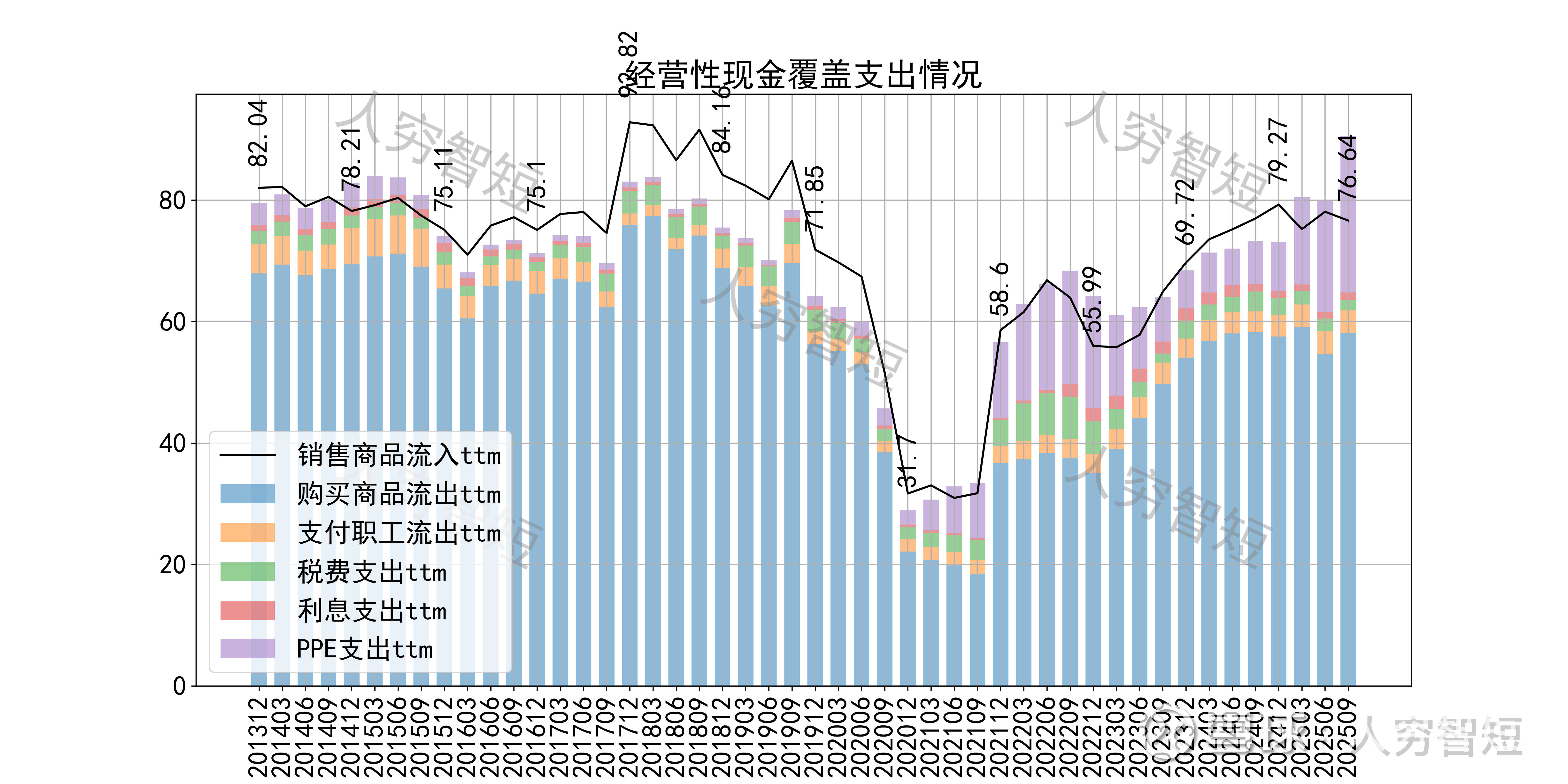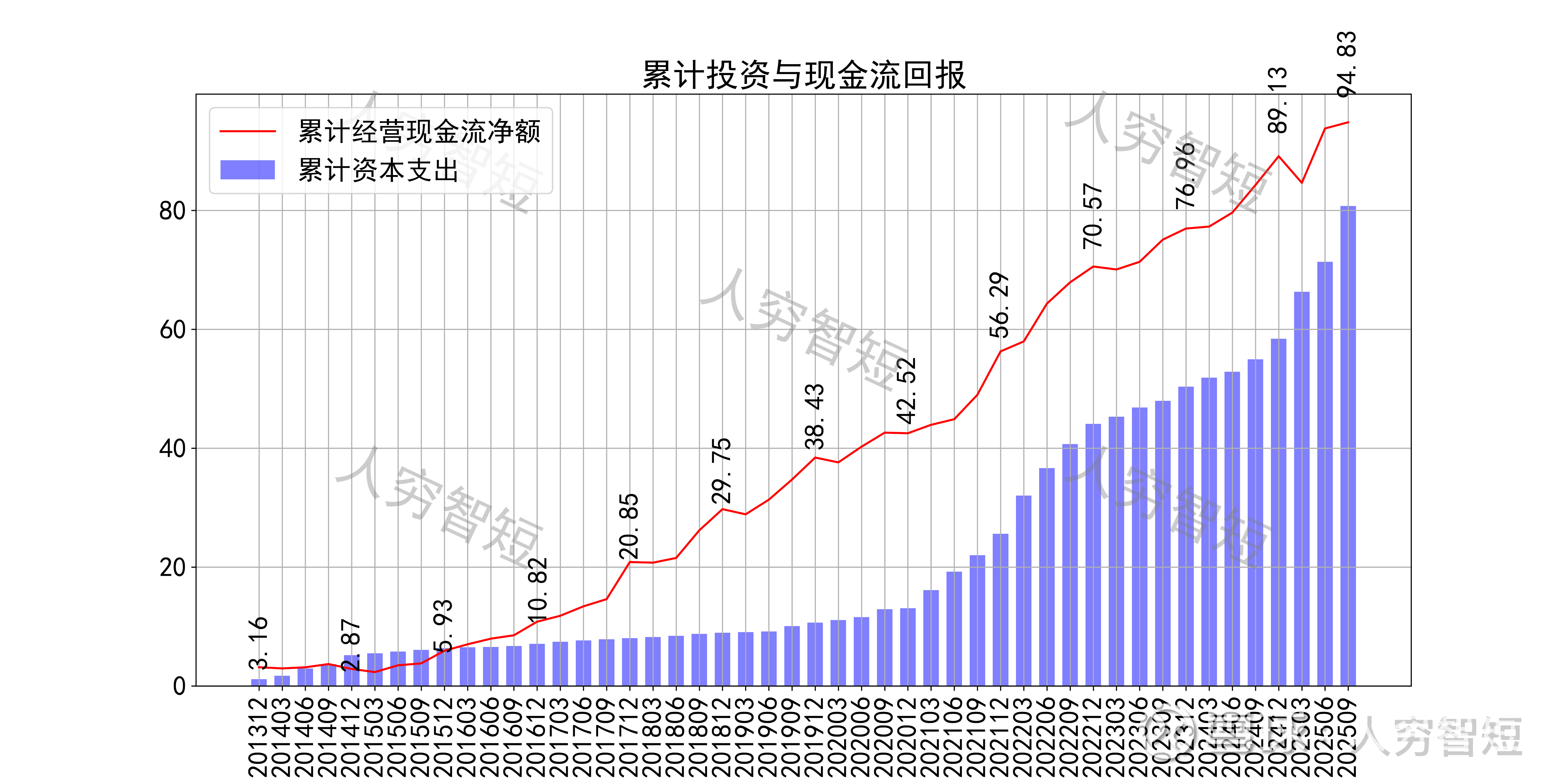 收入、利润的现金含量来看,近年来销售商品流入的现金流基本覆盖营业收入,最近几期转差但仍接近;经营现金流波动较大,平均与净利润一致,主要差异源于各项资产折旧摊销(年约4.5亿元)、投资收益(24年为2亿元)以及经营项目的变动等。