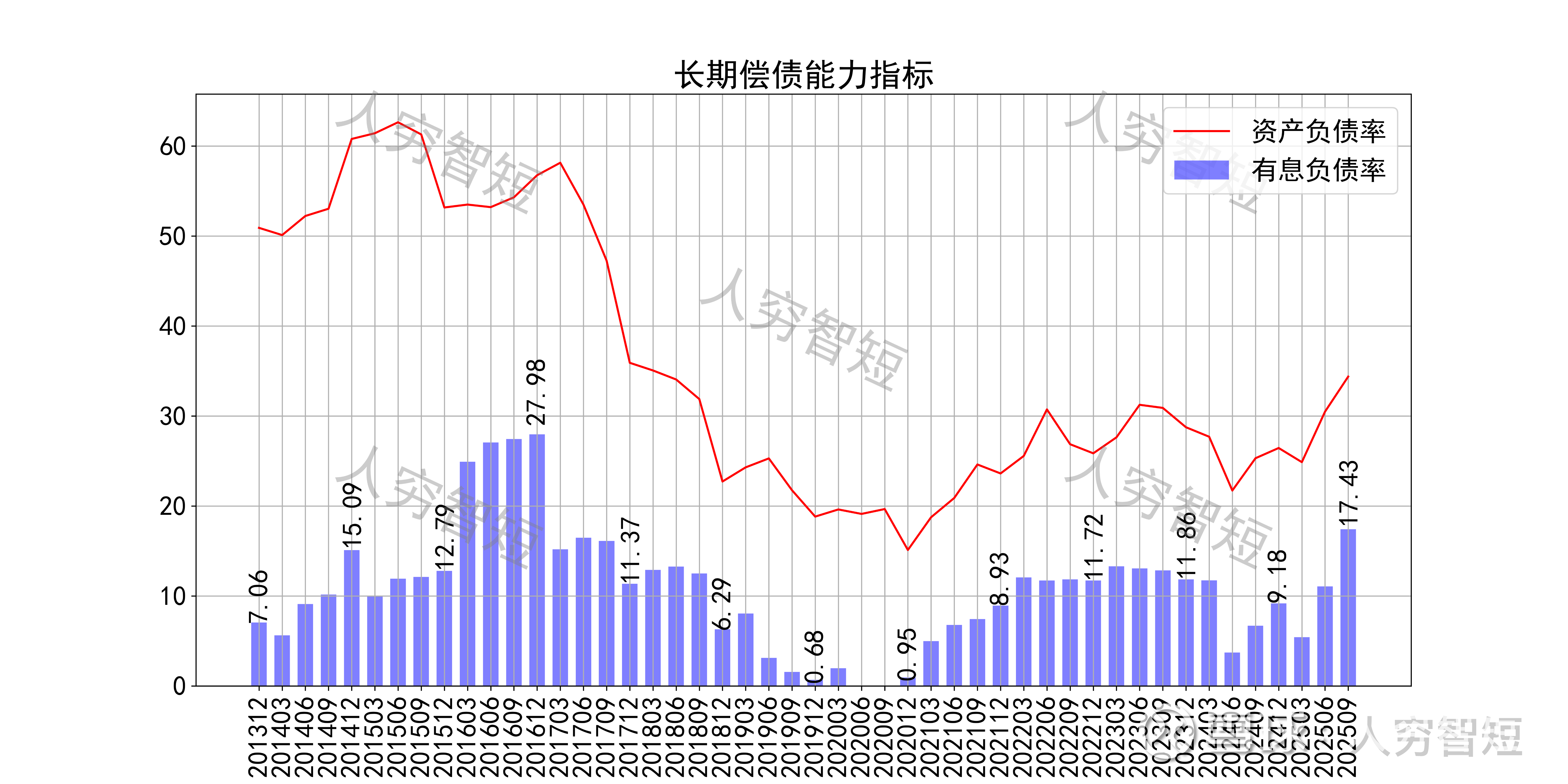 公司最近十年总资产复合增长率7.20%,截至25年9月末,为138.05亿元。资产结构以现金类资产、长期股权投资及固定资产为主。现金类资产主要为银行存款17.15亿元、存放财务公司款项7.86亿元(上海华谊财务公司),存款利率0.42%-2.10%不等,贷款利率2.11%-3.10%不等,有一定输血嫌疑。长期股权投资9.35亿元,主要为对联营企业上海亨斯迈聚氨酯有限公司投资,年投资收益贡献率约为20%,该笔股权投资回报较为可观。固定资产余额45.59亿元,主要为房屋建筑物11.84亿元,尚需折旧14年;专用设备32.63亿元,尚需折旧约10年;在建工程21.87亿元,主要为双氧水法环氧丙烷(HPPO)及聚醚多元醇一体化项目、3万吨/年催化氧化法HCl回收循环利用产业化项目等,预计总投资超过60亿元,仍处于初期投入阶段。