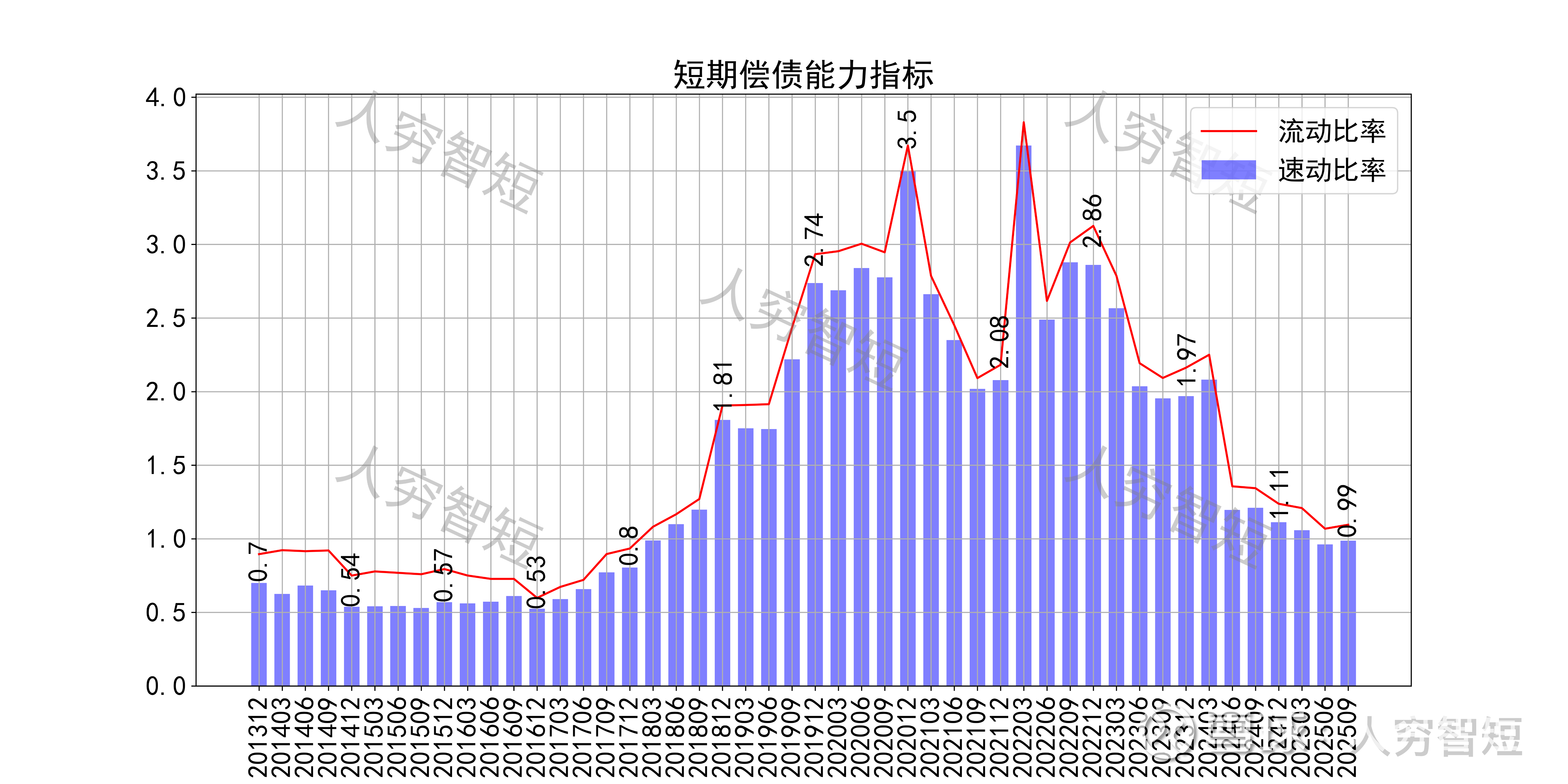 长期偿债指标中,资产负债率底部抬升,近年增加至34%左右,有息负债率约为17.43%,有一定的债务负担,对供应链上、下游资金占用一般。短期偿债指标中,流动比率、速动比率高位下滑,二者几乎无差异,主要系存货规模较低所致,资产短期流动性一般。