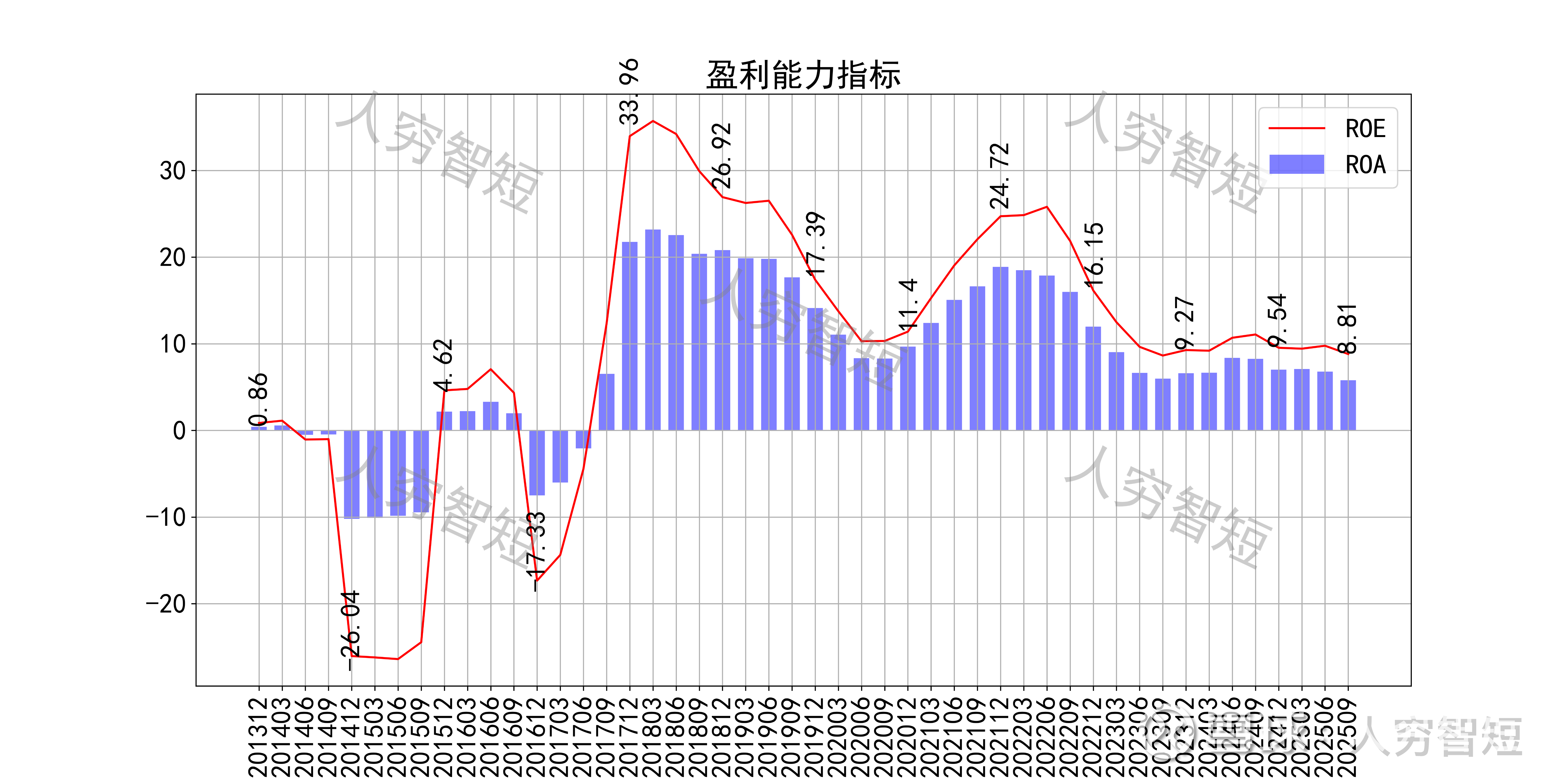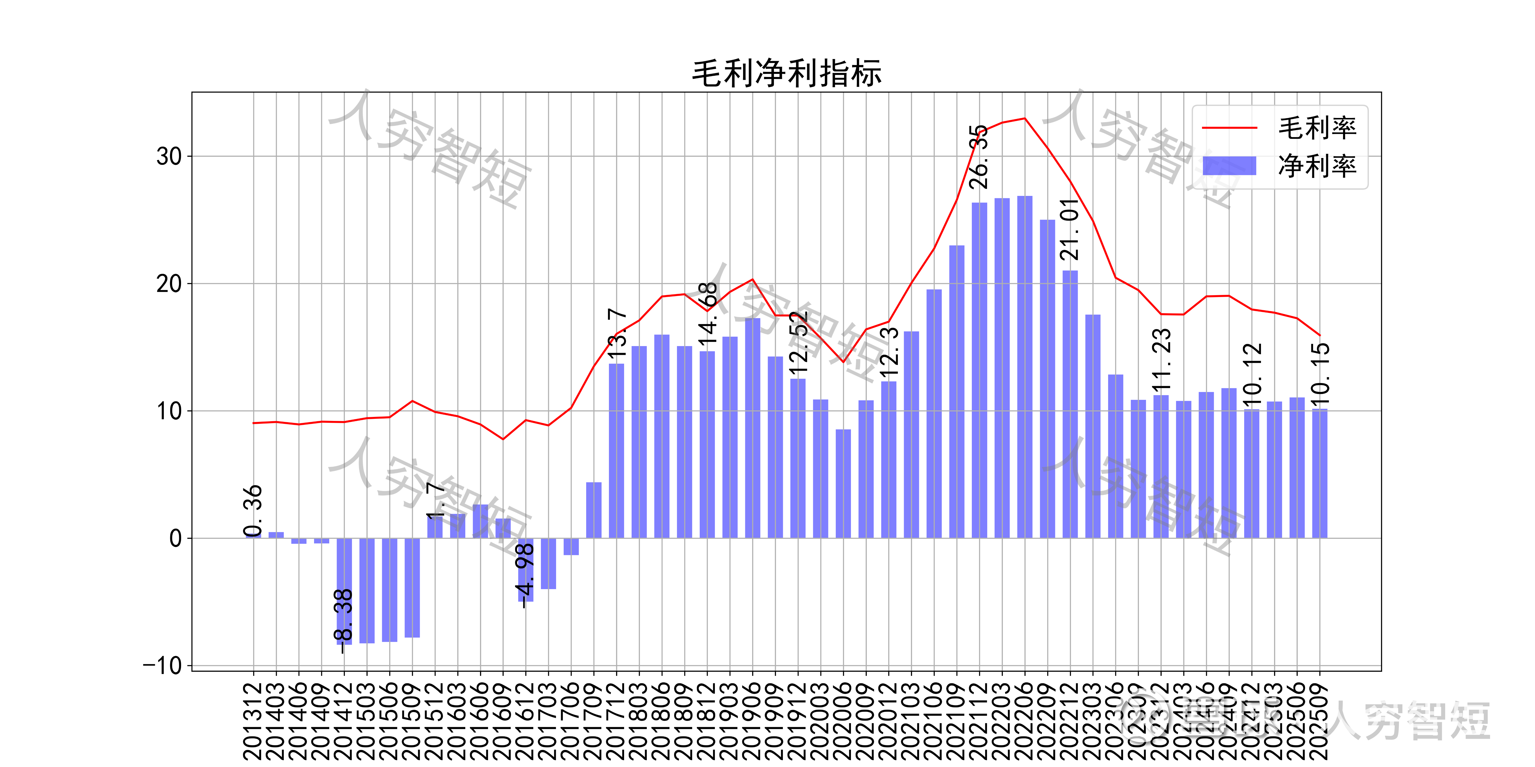 最近十年营收规模复合增长率约为1.00%,到25年9月末,TTM营业收入为78.63亿元,呈现周期性波动。成本费用端构成来看,营业成本占据主要地位,成本构成中原材料占比约80%,制造费用及动力费用有一定占比,约在8%-9%之间。整体毛利率大幅波动,近年来高位下滑至16%左右,净利率同步波动,近年来有所平稳处于历史中等水平。各项费用控制一般,销售费用、研发费用占比波动走高,带动整体成本费用占比维持一定水平。盈利指标ROE、ROA显示,盈利能力相对平稳,最新ROE在8.81%左右。