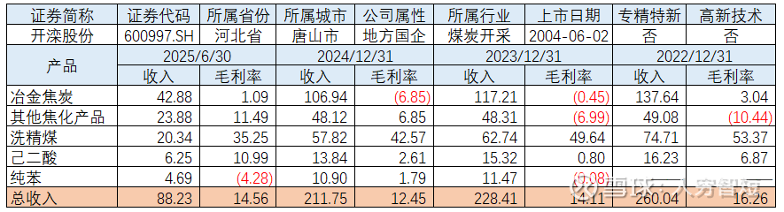 开滦股份主要产品包括洗精煤、焦炭、纯苯、甲醇、聚甲醛、己二酸和焦化副产品及其衍生品等。公司洗精煤主要用于炼焦,除销售给河钢、首钢等客户外,部分供给公司煤化工子公司作为生产焦炭的原料煤;焦炭用于钢铁冶炼,主要销售给首钢、河钢等钢铁企业,主要客户为河北钢企,销售占比超过50%;炼焦副产品焦炉煤气用于生产甲醇,粗焦油、粗苯用于深加工;甲醇、纯苯是重要的有机化工原料,部分甲醇作为生产聚甲醛的原料,部分纯苯作为生产己二酸的原料,其余均对外销售。截至最新,公司具备900万吨/年的原煤生产能力,焦炭660万吨/年、甲醇20万吨/年、己二酸15万吨/年、聚甲醛4万吨/年的生产能力和30万吨/年焦油加工、20万吨/年粗苯加氢精制的加工能力;2025年半年度,原煤产量460.04万吨、商品煤产量299.53万吨,均小幅增长;数据披露测算洗精煤吨煤完全成本约为864元、冶金焦吨煤完全成本约为2174.86元,成本劣势较大。