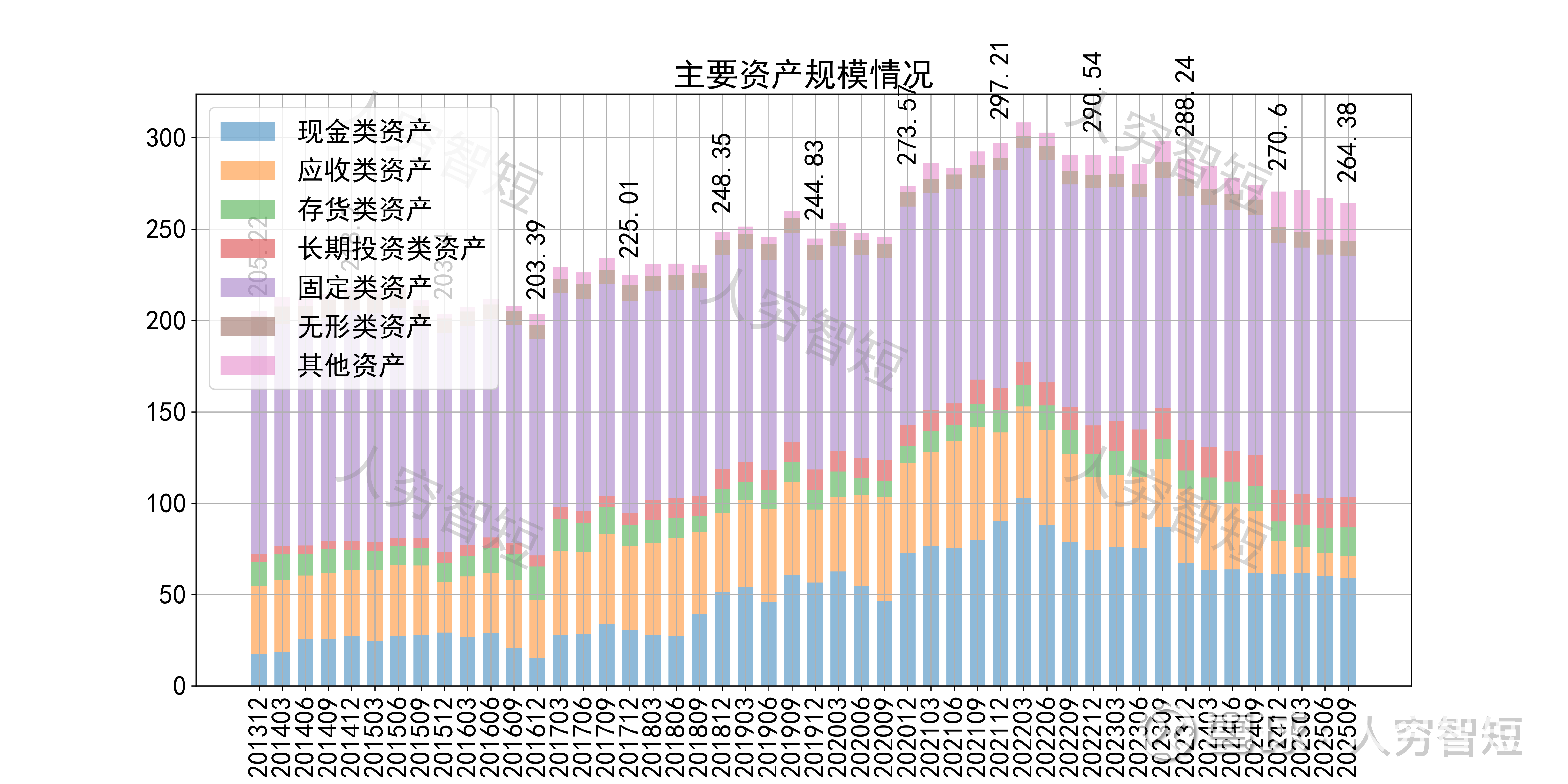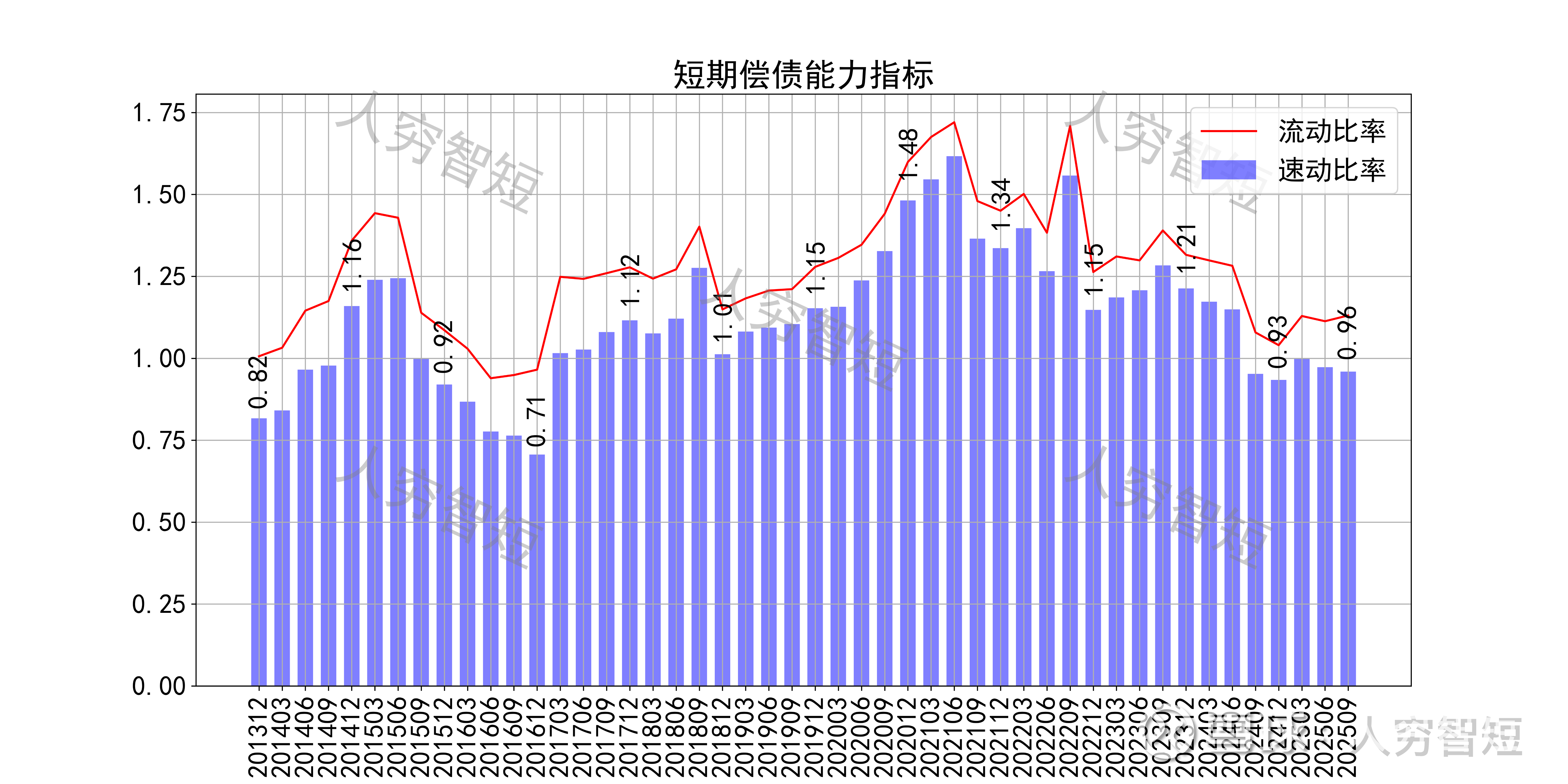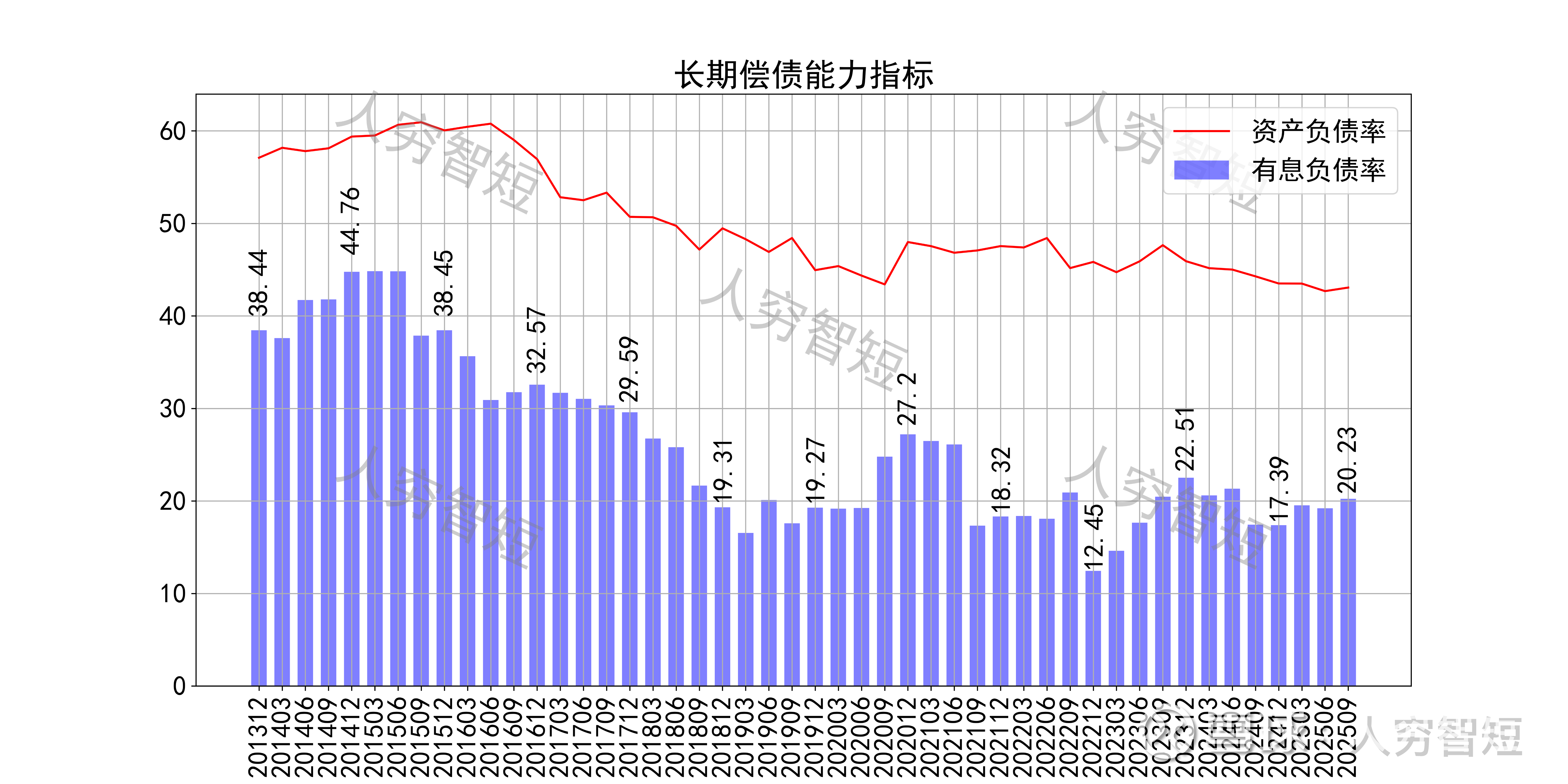 公司最近十年总资产复合增长率2.13%,截至25年9月末,为264.38亿元。资产结构以现金类资产、应收账款、存货、固定资产及其他资产为主。应收账款余额7.23亿元,规模持续下滑,账龄以1年内为主,总体期限结构良好。存货余额13.31亿元,总体规模有所增长但仍较低,主要为原材料及产成品,未看到存货大规模累库。固定资产余额117.64亿元,主要为房屋建筑物38.59亿元,尚需折旧23年;机器设备72.10亿元,尚需折旧约11年;在建工程14.77亿元,主要为唐山聚甲醛及其配套项目、10万吨/年己二胺项目、尼龙66项目、加拿大盖森煤田勘探项目等,总体扩张在于煤化工端。