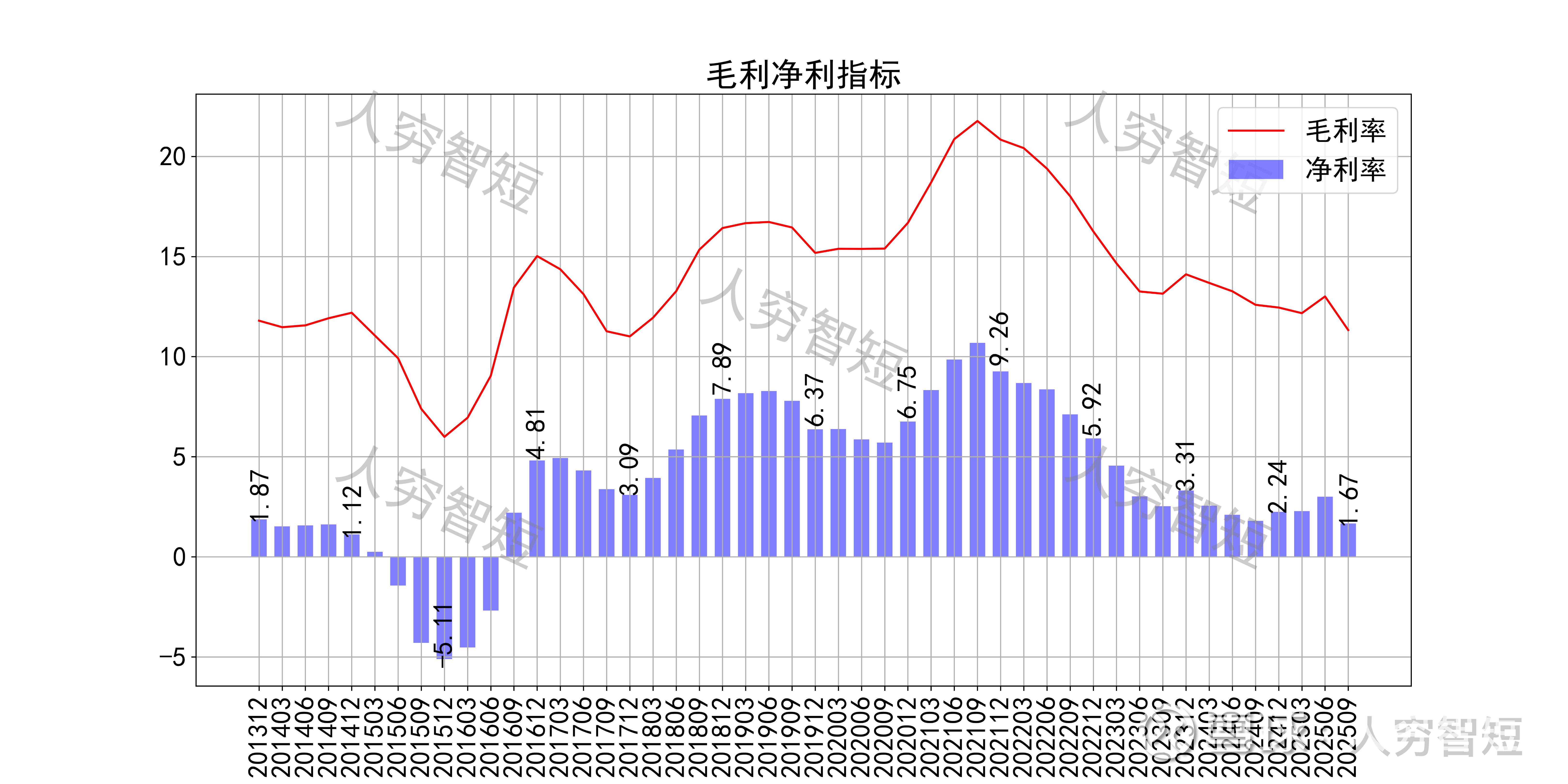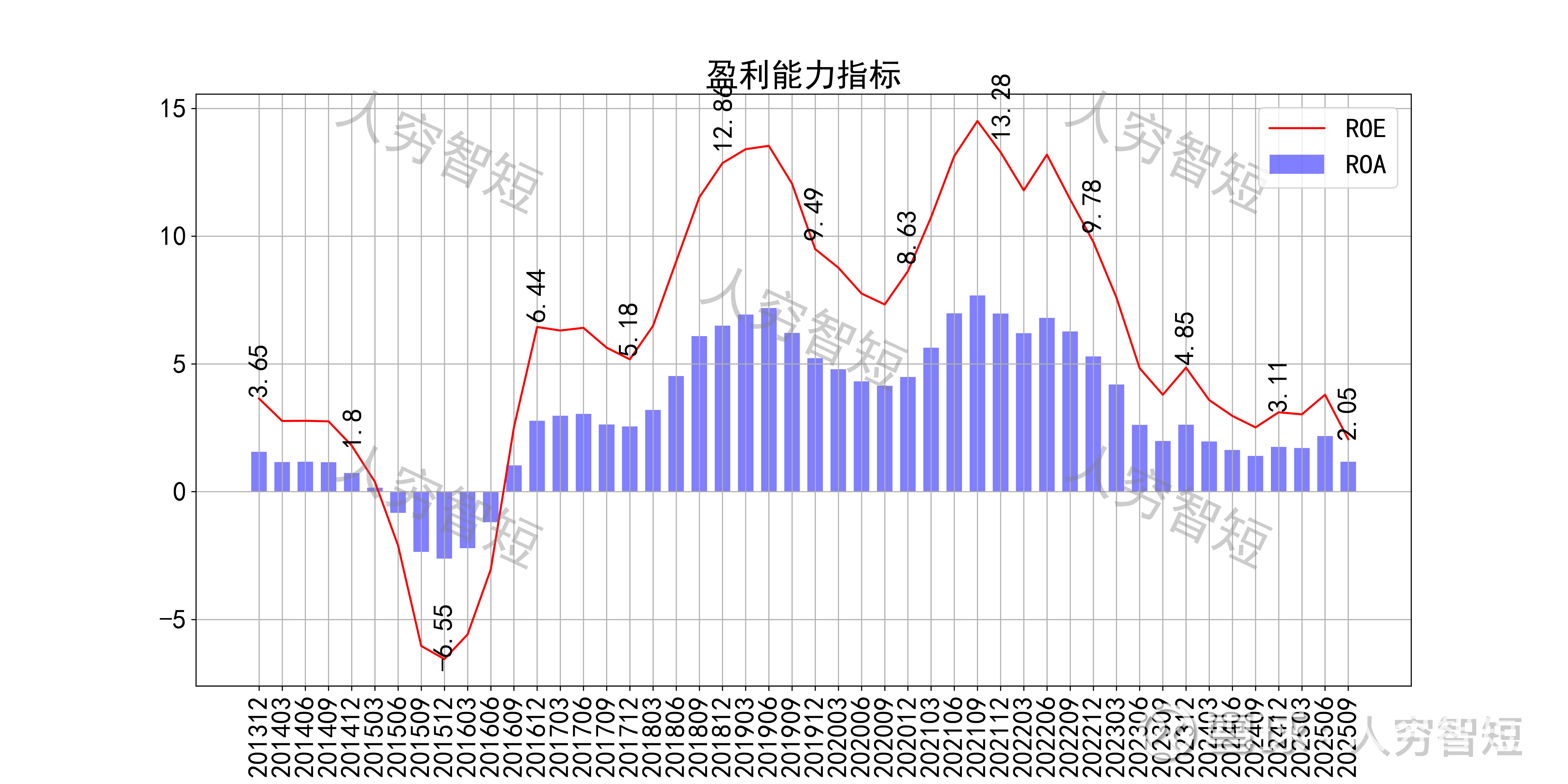 最近十年营收规模复合增长率约为0.63%,到25年9月末,TTM营业收入为185.29亿元,自高位持续下滑。成本费用端构成来看,营业成本占据主要地位,成本构成中煤炭采选以人工及制造费用为主、煤化工以原材料支出为主。整体毛利率同步波动,近年来高位下滑至12%左右,净利率持续走低处于历史较低水平。各项费用控制较差,管理费用、研发费用占比缓慢走高,带动整体成本费用占比维持高位。盈利指标ROE、ROA显示,盈利能力自高位持续增长,最新ROE在2.05%左右。