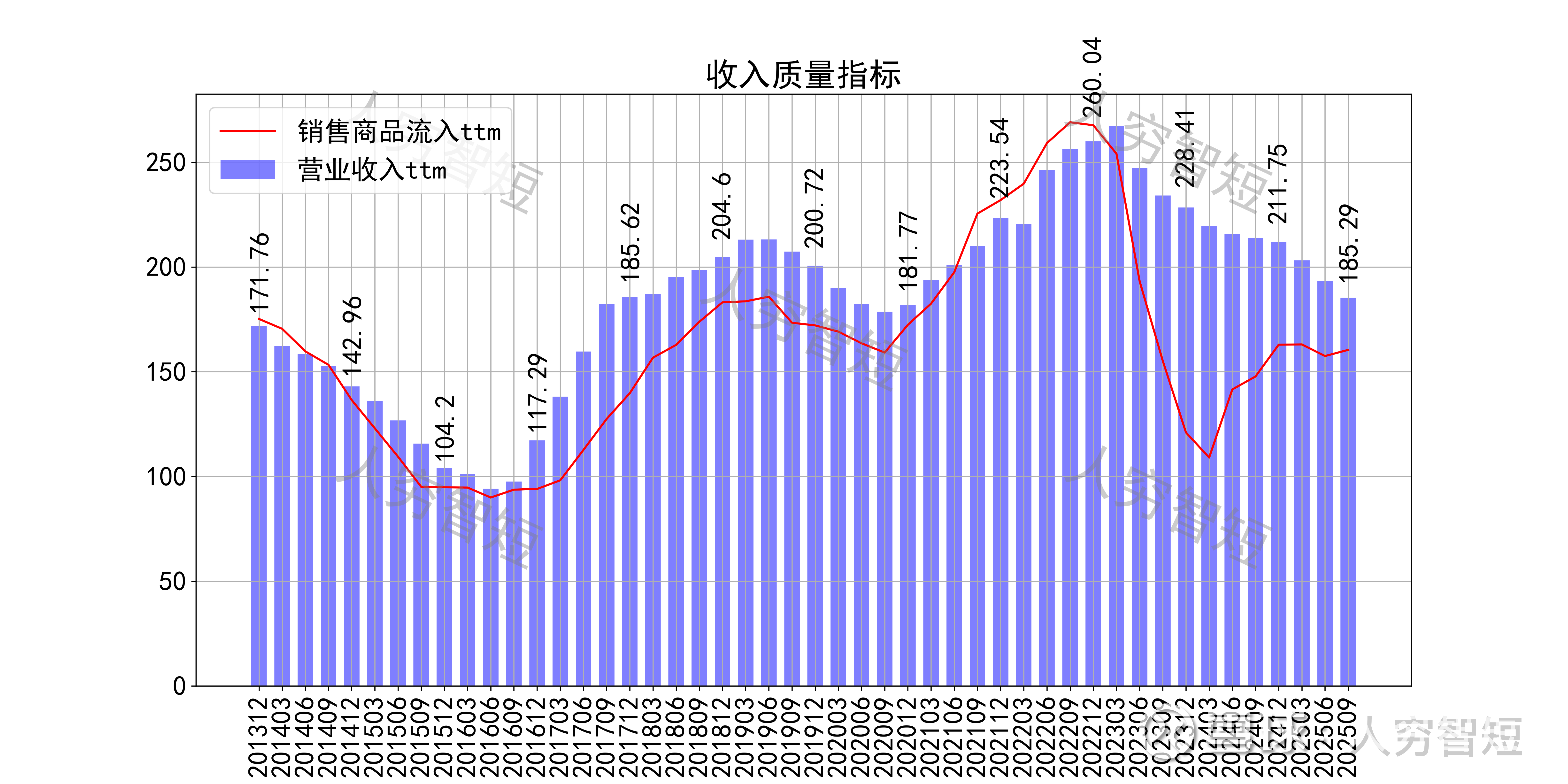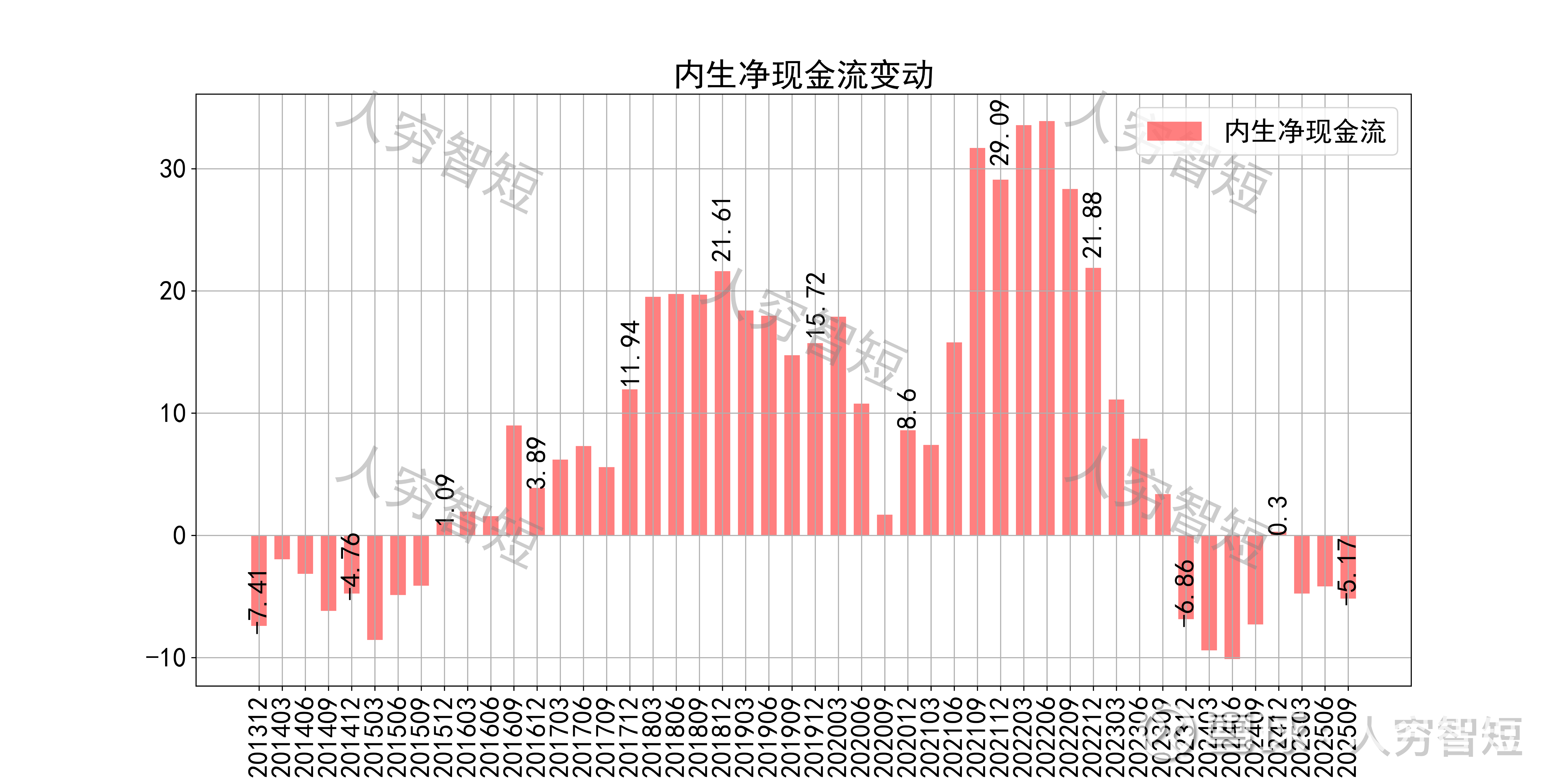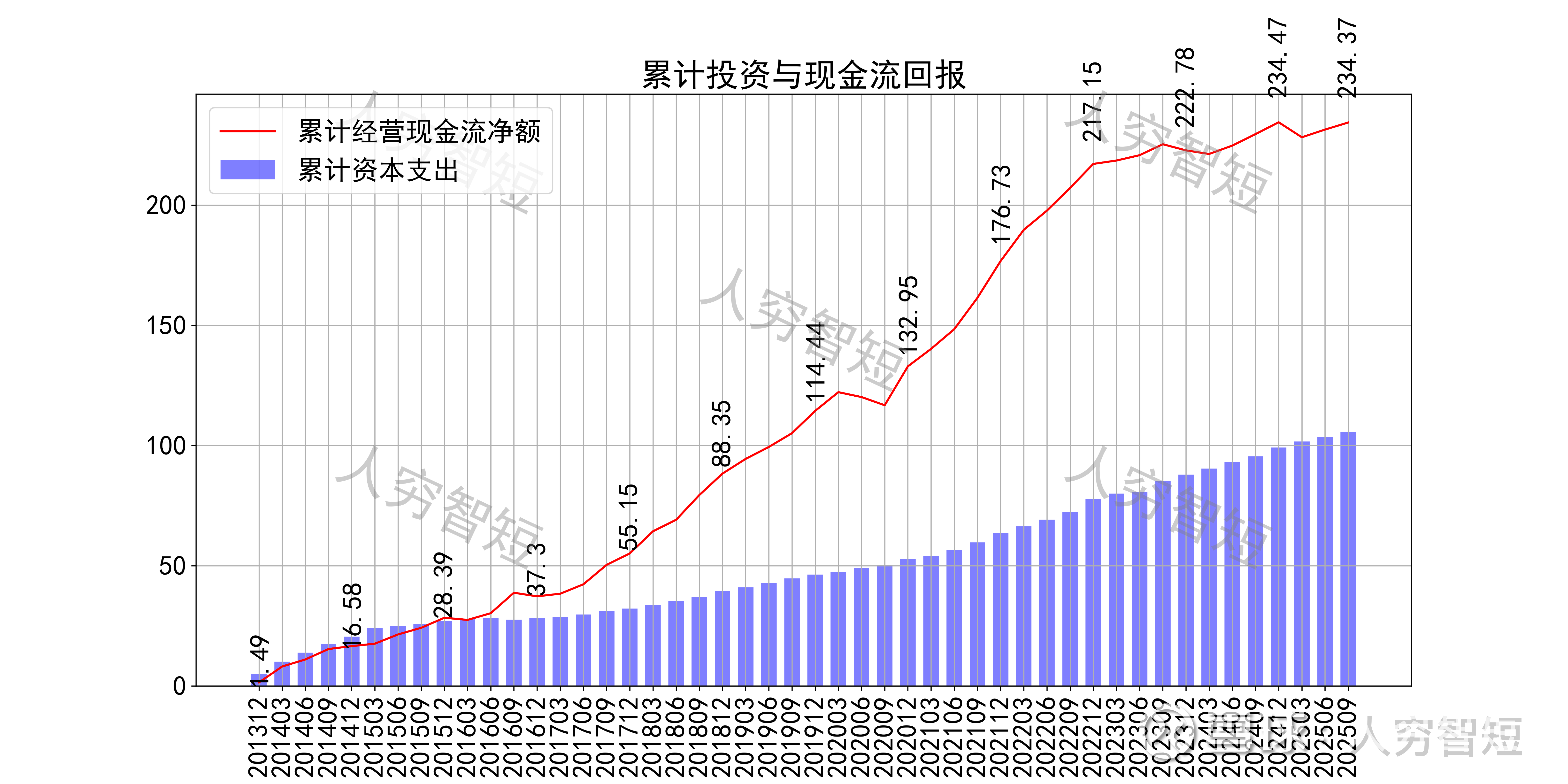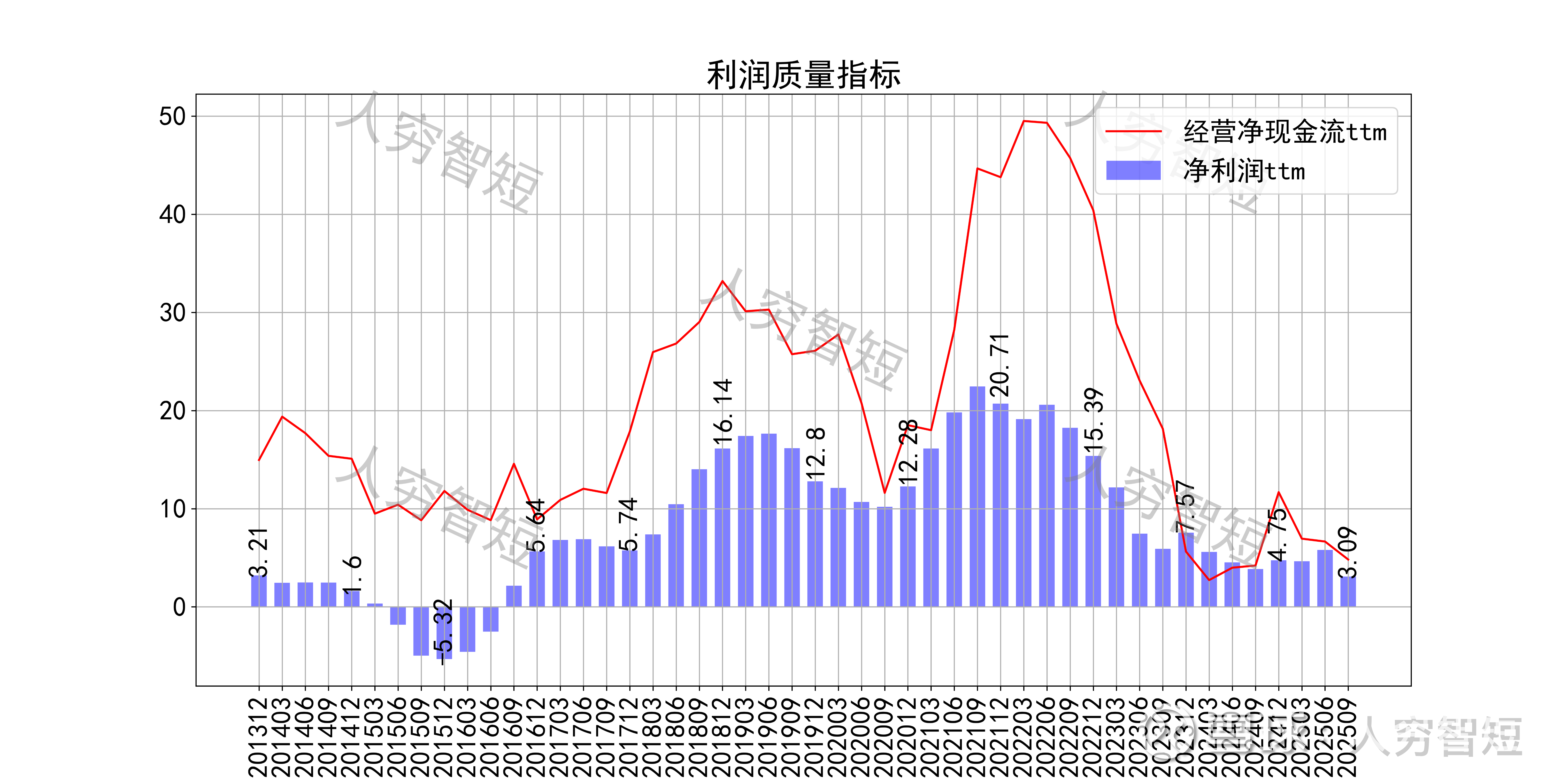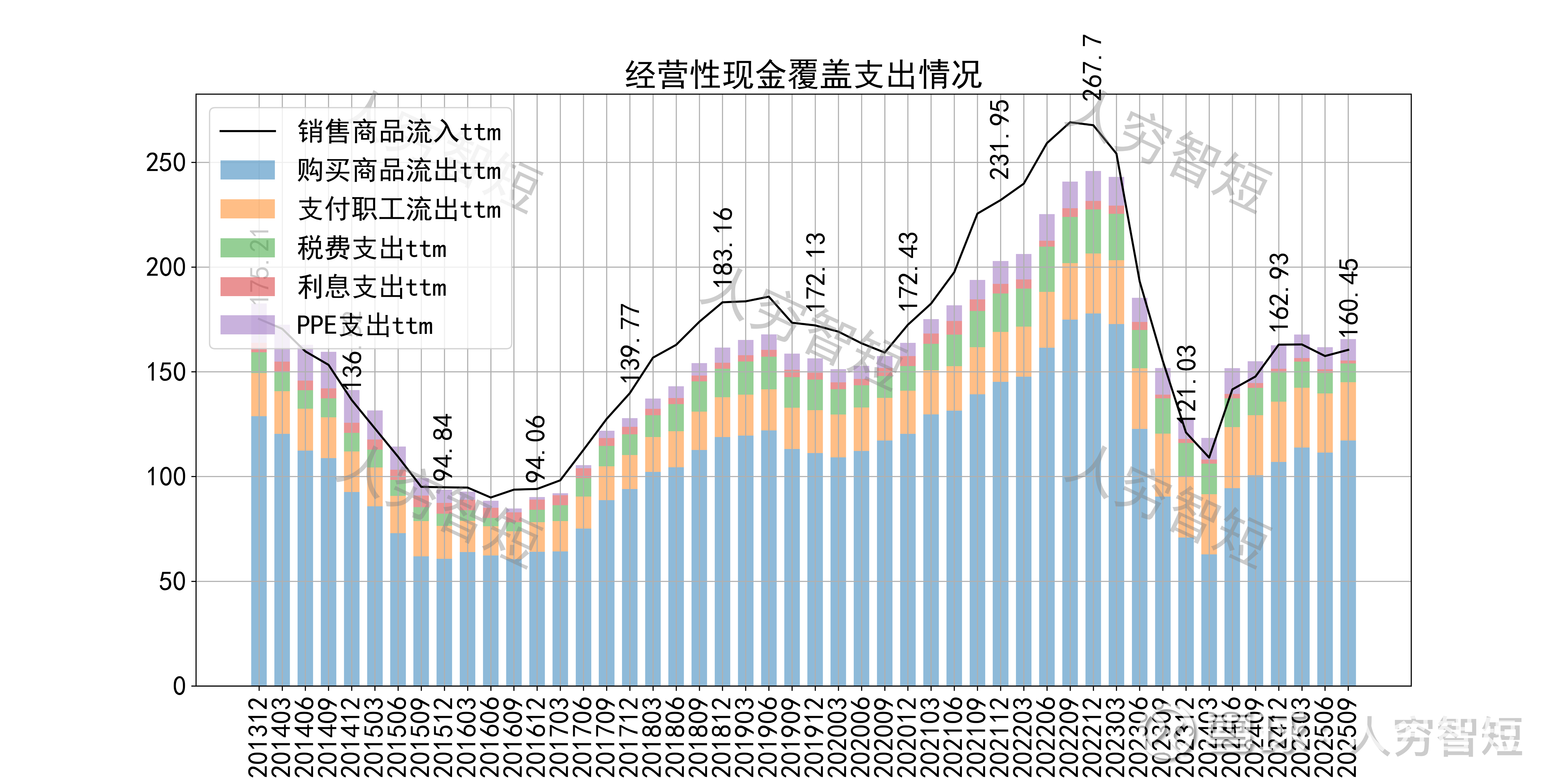收入、利润的现金含量来看,近年来销售商品流入的现金流未能覆盖营业收入,主要系开展应收款融资业务增多所致;经营现金流波动较大,平均净额高于净利润,主要差异源于各项资产折旧摊销(年约11亿元)、财务费用(24年为2.2亿元)以及经营项目的变动等。