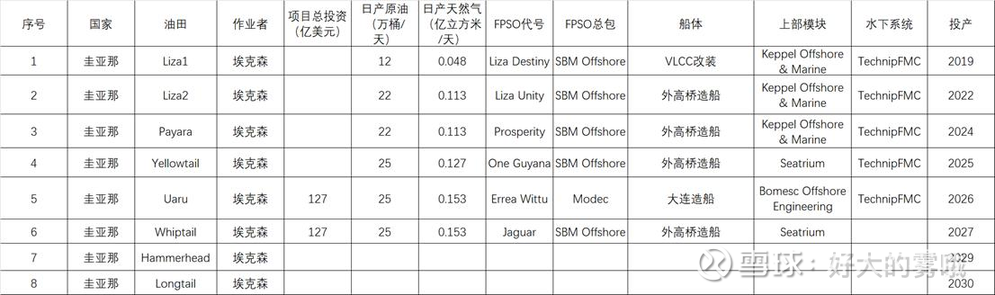 深水项目主要包括两部分:FPSO和水下工程(Subsea)。与FLNG一样,FPSO也包括船体和上部模块两部分。水下工程包括采油树、油气管汇、处理控制单元以及海底管线立管等。海油工程在深水项目的实力一般,在海外项目中仅参加上部模块的分包工作。近期参与建造的巴油P79项目在韩国韩华船厂发生了安全事故,造成业主方巴油一名员工死亡,不知道与海油的上部模块有没有关系。下面两张表是巴西和圭亚那FPSO船的统计情况。