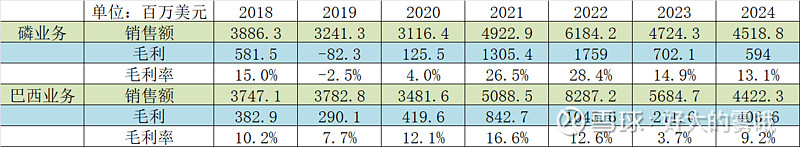 由于美盛除了磷业务,还有钾业务,其合并利润表不能反映磷业务的盈利能力,只能通过分部数据进行分析。美盛财报中业务分三部分:磷业务、钾业务和巴西肥料业务。其中磷业务包括美国、秘鲁的控股磷矿和磷加工厂以及沙特的参股磷业公司。巴西肥料业务不仅包括美盛在巴西的磷业公司,还包括肥料销售和配送业务,分部毛利反映的不完全是巴西磷矿的盈利能力,请注意。下表为美盛磷相关业务的毛利统计,可看出整体上讲美盛的磷业务竞争力一般,2023年磷业务分部毛利率仅为14.9%,同期云天化的磷肥业务毛利率33%。