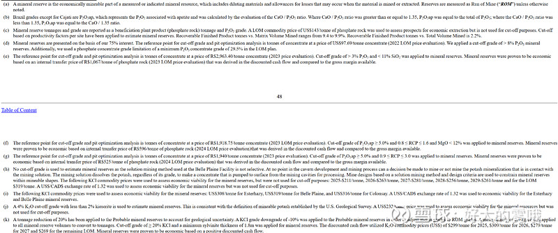上图中佛罗里达州的储量只包括在产的三个磷矿,不包括停产和待建的磷矿。红圈中显示佛罗里达州磷矿品位27.4%,很不错,然而看下图中的注释C,明确指出该品位数据是按照选矿后的品位报告的,而原矿品位并没公开。这可能也是国内很多人和文献都认为美国磷矿品位高的原因。这些注释里还有其他有意思的地方,比如“Recoverable Finished Product tonnes vs. Total Volume Mined is 2.2%”, 这句话的意思不知道是不是“挖100吨表土和矿石只能得到2.2吨成品”。还有“A LOM commodity price of US$143/tonne of phosphate rock was used to assess prospects for economic extraction but is not used for cut-off purposes”,表明143美元/吨的磷精矿价格用于评估磷矿开采的经济性,若磷矿低于此价格,储量必会进一步降低。而美盛秘鲁磷矿储量评估的参考价格为97.69美元/吨,可能表明秘鲁磷矿的开采成本更低。2018年秘鲁磷矿开始开采后,美国本土磷矿产量开始下降,可能也是两地磷矿成本差异的体现。而巴西几个矿的精矿评估参考价格分别为2963.4雷亚尔/吨、1918.75雷亚尔/吨和1940雷亚尔/吨,即便按照2024年底雷亚尔美元汇率最低的时候6.18计算,也分别为479.5美元/吨、310.5美元/吨和313.9美元/吨。数值特别高,不知道原因在哪里,有可能的原因是:(1)巴西磷精矿的品位高(34%以上);(2)美盛巴西的磷矿很差;(3)我理解错了。