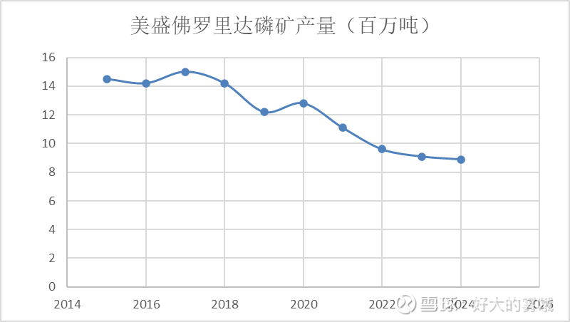 下图为美盛美国本土的磷精矿产量趋势(2015~2024),从1400万吨左右降低至不到900万吨。