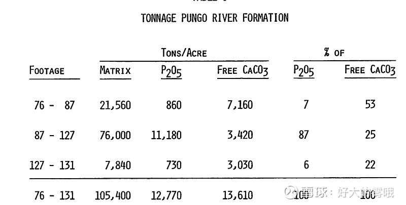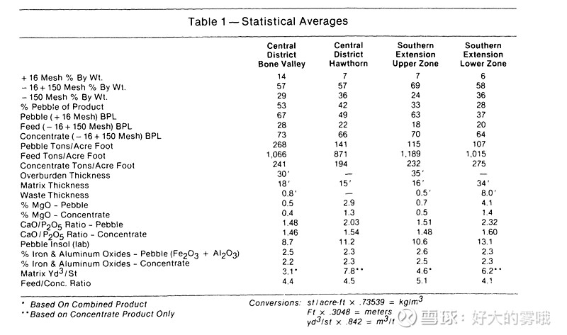 从此表中可看出,最好的矿是中部的Bone Valley地层,Pebble重量占比、Pebble的磷含量以及MgO含量都优于其他地层或区域的磷矿。