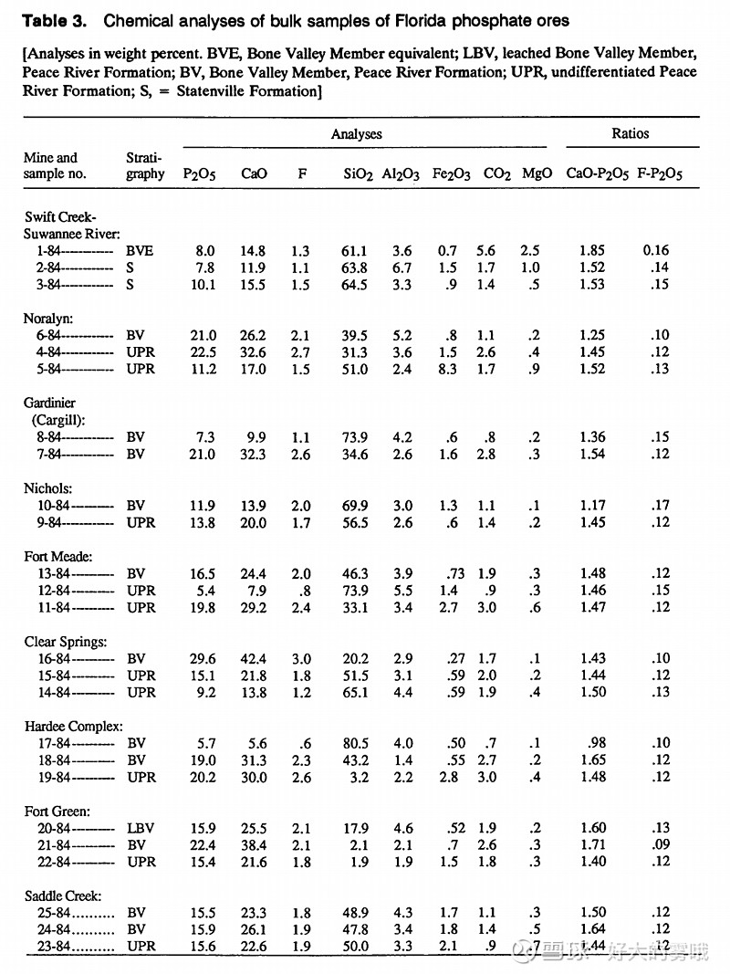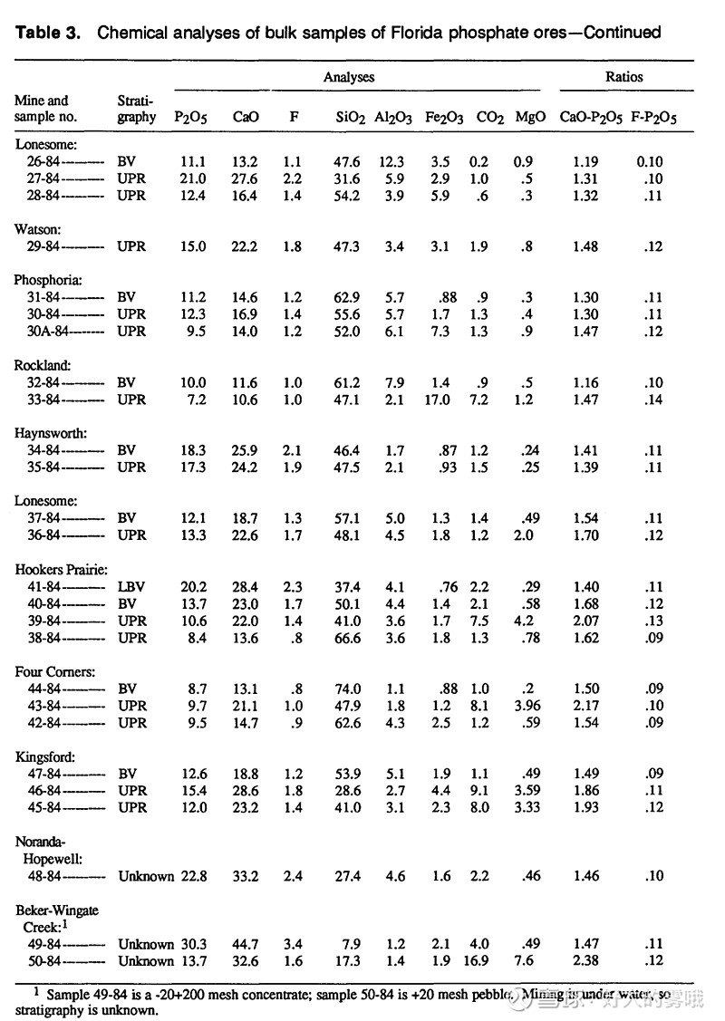 以下两张表是佛罗里达中南部磷矿的化学成分分析【5】: