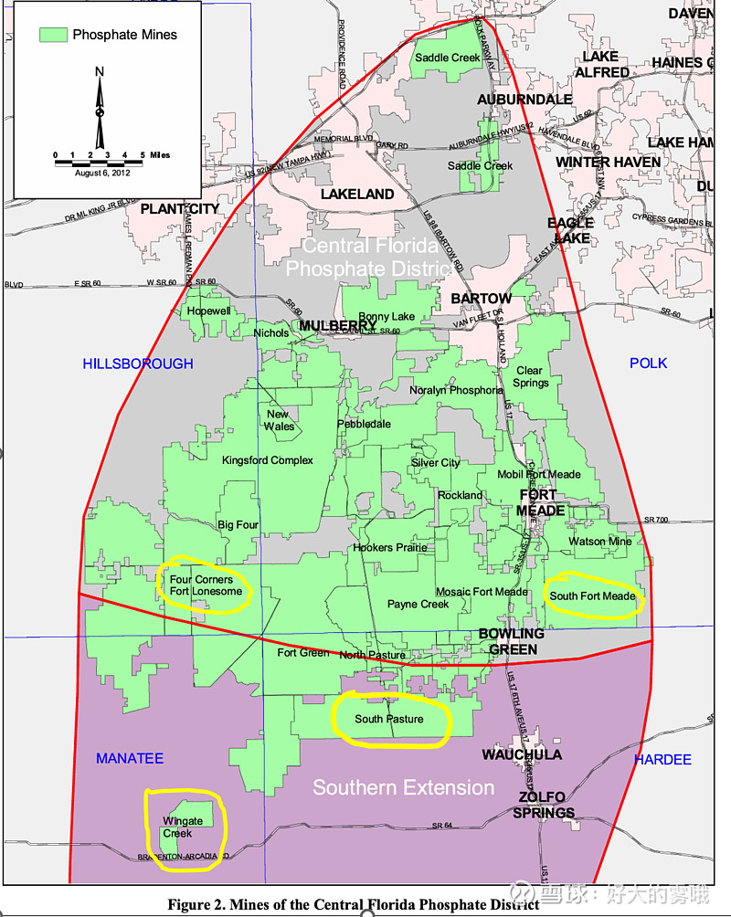 其中蓝色区域为正在开采的磷矿区,其他区域的磷矿无开采价值。北部的是Nutrien的White Springs矿,估计储量已接近枯竭。中部及其南向延伸区的磷矿属于Mosaic,更详细的分布如下:
