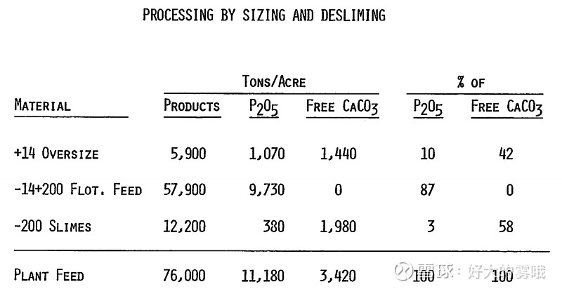 与佛罗里达磷矿不同,该地的磷矿粗颗粒CaCO3含量高,不能使用。只有14至200目之间的颗粒才能利用,并且全部需经过浮选提升品位和除杂。