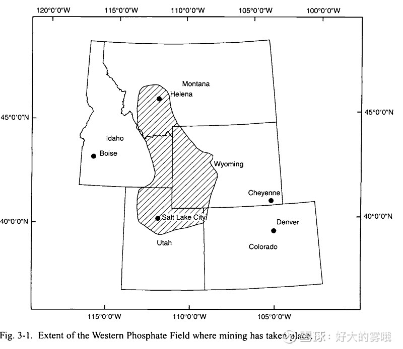 美国西部磷矿区是美国乃至世界上磷资源量最大的地区之一,位于Idaho、Montana、Utah以及Wyoming等州的交界处,总分布面积超过35万平方公里,总的磷资源量高达几百亿吨,适合露天开采的也有数十亿吨【8】【9】。
