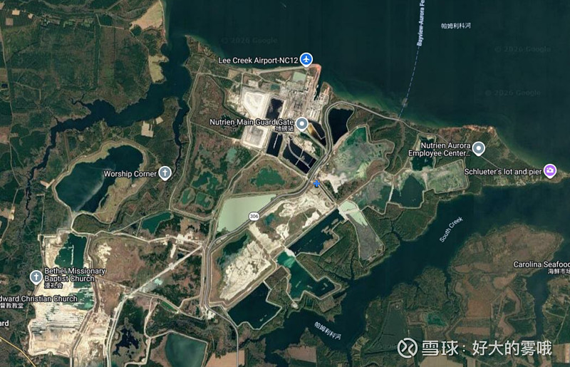 北卡罗莱纳仅有Nutrien的Aurora磷矿在生产,其地理位置和卫星图如下【6】:
