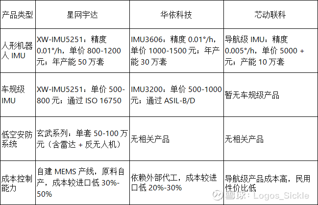 结论:星网宇达在中高端产品(如机器人 IMU、车规级 IMU)上性价比最优,成本较华依科技低 10%-20%,且量产能力(50 万套 / 年)远超同行,可支撑大规模订单交付;芯动联科产品精度最高但价格昂贵,难以适配民用性价比需求。