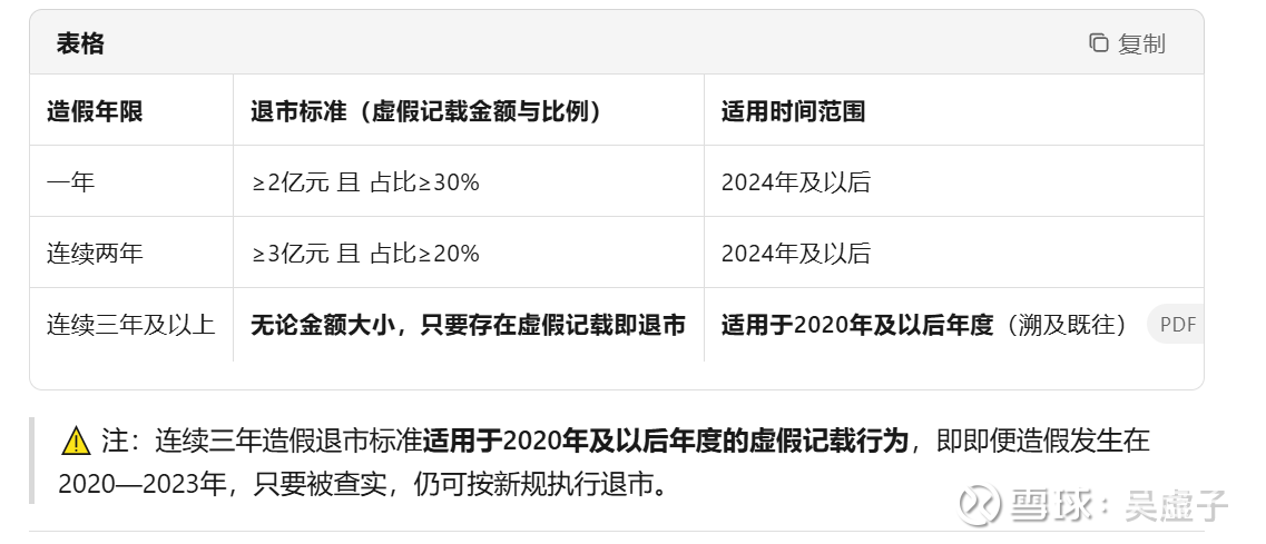 3、连续三年及以上造假:无论金额大小,只要连续三年存在虚假记载,即构成重大违法退市情形。