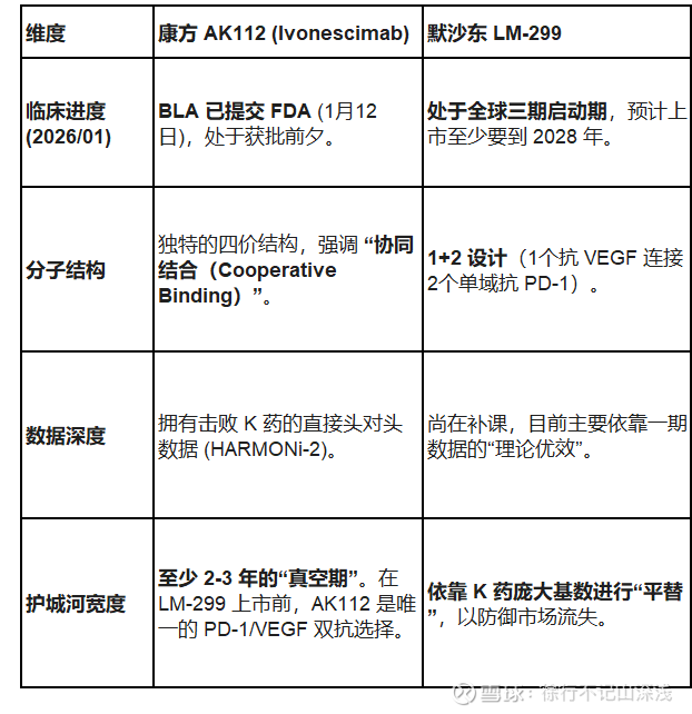 为了看清康方 AK112 的“领先身位”到底有多厚,我们需要将它与默沙东最核心的防御性资产 LM-299(2024年底购入)以及其整体商业化壁垒进行深度对撞。