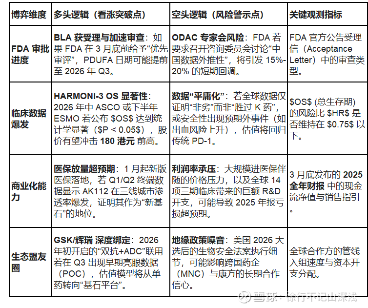 不要在 ODAC 前夕全仓:尽管 AK112 数据极佳,但 FDA 专家会的不可预测性是 Biotech 最大的“黑天鹅”。如果 2026 年中宣布要开专家会,建议先减掉杠杆。