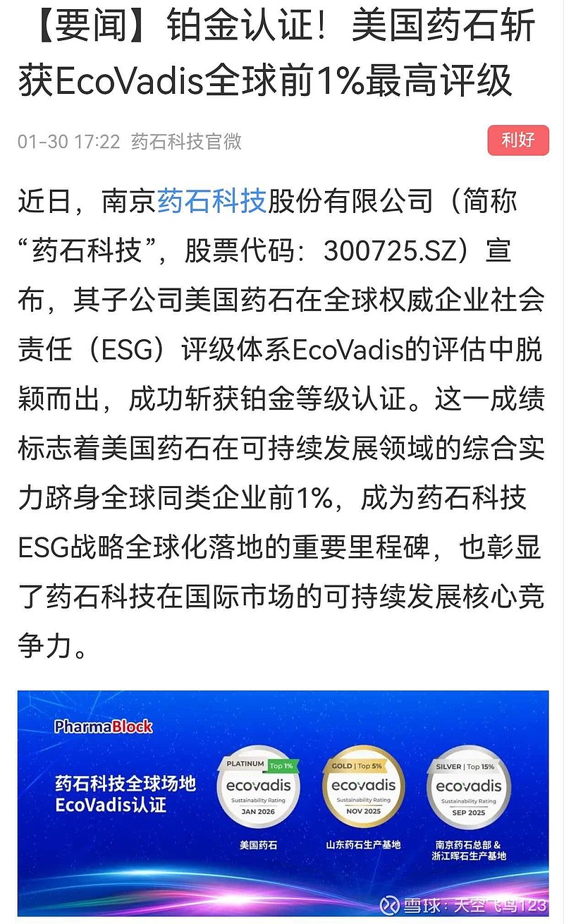 [要闻]铂金认证!美国药石斩获EcoVadis全球前1%最高评级