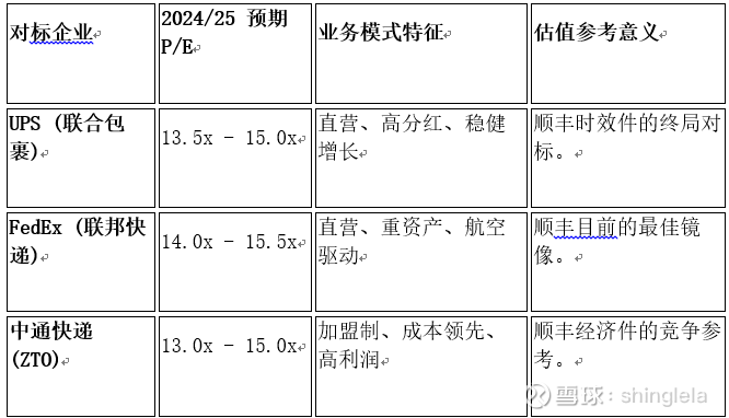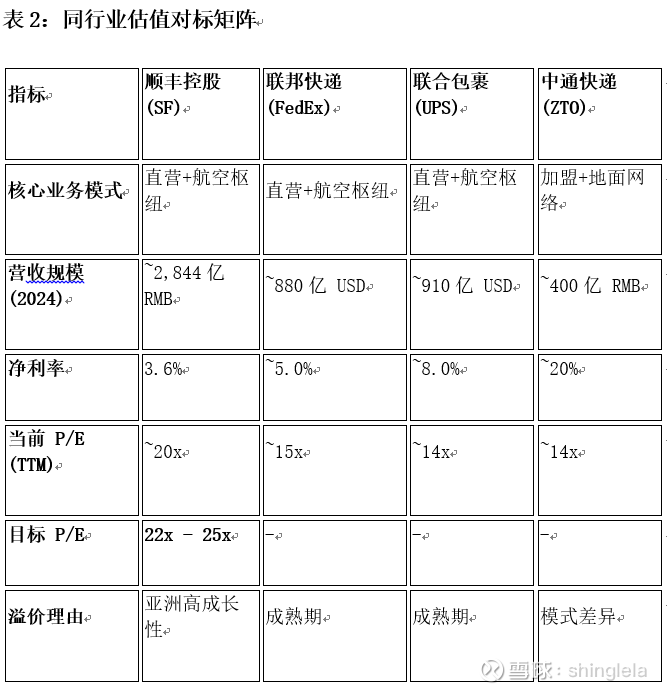 增速优势: 顺丰的营收增速(~10%)显著高于UPS/FedEx(低个位数),理应享受成长性溢价。