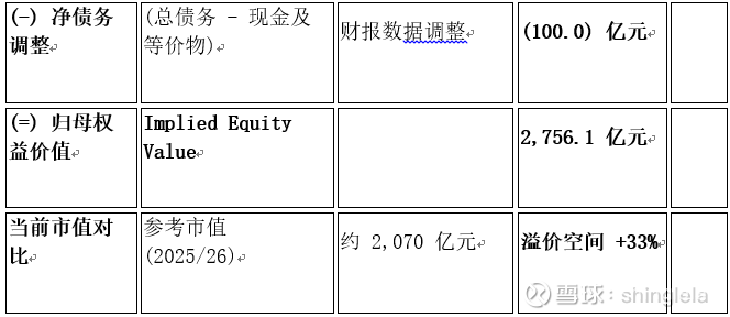 顺丰控股资产负债率约52%,但账面持有大量现金及理财产品(约450亿元),经营性现金流强劲(EBITDA超320亿元),实际净债务水平较低。此处保守扣除100亿净债务调整。