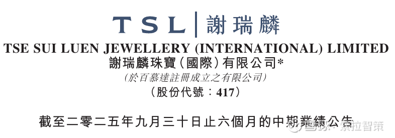 2025年11月18日,谢瑞麟珠宝(国际)有限公司公布了截至同年9月30日止6个月的中期业绩。报告期内,面对全球经济放缓及金价高企等外部挑战,谢瑞麟录得营业额7.32亿港元,较去年同期下降15.3%。根据中期业绩报告,集团营业额下降主要受天然钻石珠宝需求持续疲软及主动收缩自营店网络所致。同时产品组合策略性地向毛利率相对较低的24K金产品倾斜,导致整体毛利率由去年同期的34.4%下降至31.1%。