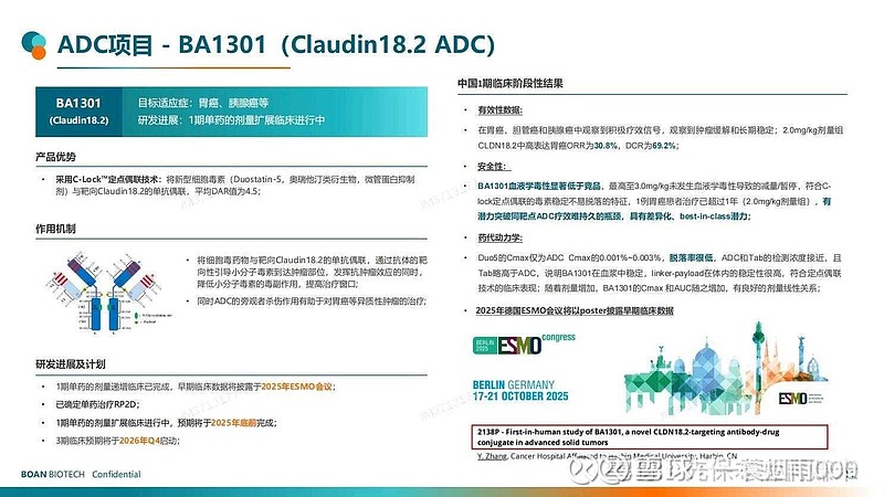 $博安生物(06955)$ 公司半年度PPT仔细看信息量还是很大:1.BA1301在剂量为2mg时ORR为30.8%,DCR为69.2%,这只是证明了有效性。下一段表述为:最高至3mg未见血液毒性导致的减量/暂停,这证明了安全性,以此推断未来临床采取的剂量很可能3mg左右,从外行人的角度推断剂量提升50%,ORR应该会进一步提升(安全的前提下,下猛药治大病逻辑貌似是成立的),而且提升的幅度显著并且超过同类竞品,否则不会说“具有差异化,best-in-class潜力”。因为博安生物的进度是靠后的,靠前企业的数据作为同行不可能不掌握,没有信心不会在公开场合满口胡诌自己有BIC的潜质。再者,2mg的数据在半年报的PPT中已披露,吊足大家胃口,请大家期待ESMO的数据发布,只可能比这个数据更好。