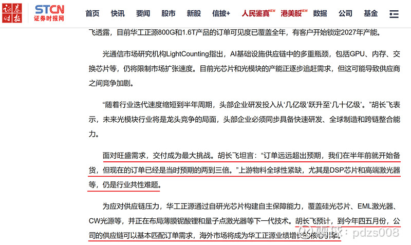 胡长飞:“面对旺盛需求,交付成为最大挑战。胡长飞坦言:“订单远远超出预期,我们在半年前就开始备货,但现在的订单已经是当时预期的两到三倍。”上游物料全球性紧缺,尤其是DSP芯片和高端激光器等,仍是行业共性难题。”