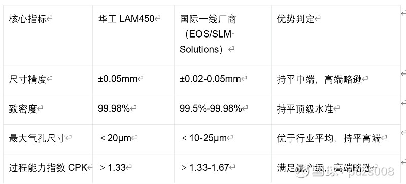 国际厂商核心优势集中在航空发动机、医疗植入物等极端精密、高可靠性场景,成形精度与材料一致性经过数十年验证;华工LAM450在主流商用场景的成形质量,已达到国际一线水准,部分核心指标实现反超,仅极端高端场景存在差距。