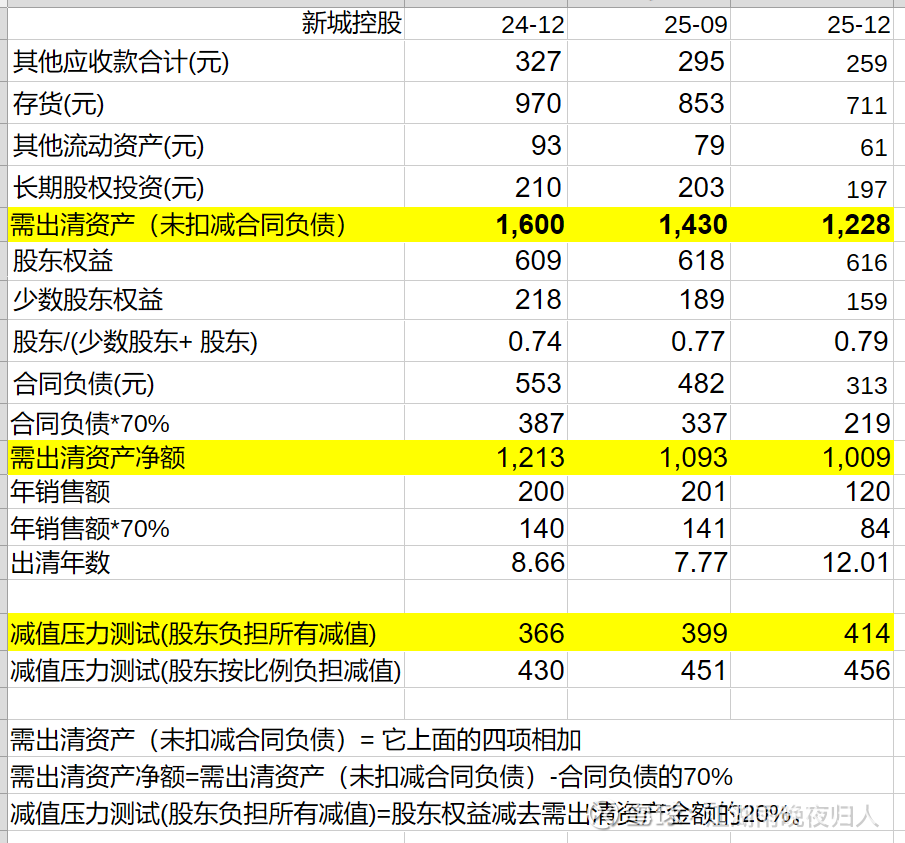 我感觉这是非常非常危险了,毕竟需出清资产还有1000亿,减值压力测试使用的是需要出清资产打八折,现在看来是太过保守了,应该按七五折,因为毕竟剩下的货都是越来越难卖的。如果按75折的话,那么真实净资产只剩364亿了,那等于是2025年原地踏步。