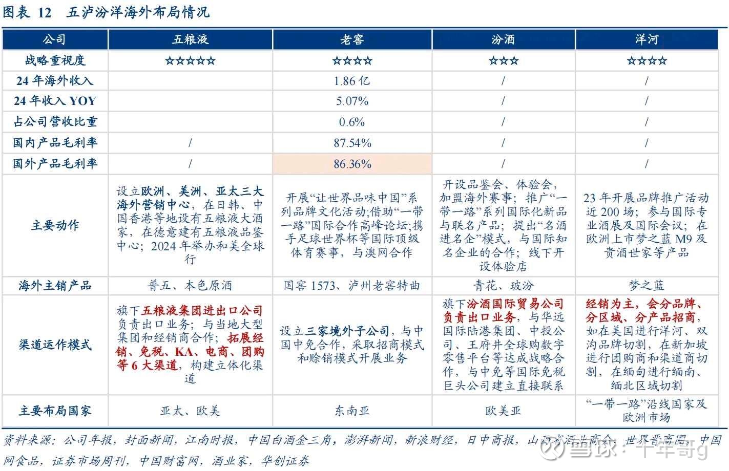 泸州老窖:以东南亚为海外主要市场,发力文体营销。2024年泸州老窖境外营收1.86亿元,同增5.07%,占总营收的0.6%,相较于茅五占比偏低。公司已在70多个国家和地区建立了经销网络,其中东南亚为主要出口市场。公司延续国内常采取的文体营销,在纽约、巴黎、莫斯科等地开展“让世界品味中国”系列品牌文化活动,赞助“一带一路”国际合作高峰论坛,以及澳网、足球世界杯、国际乒联世界杯等国际顶级赛事。出口产品以中高线的国窖、特曲为主,毛利率略高于国内,并迎合国外消费偏好发展调饮鸡尾酒。