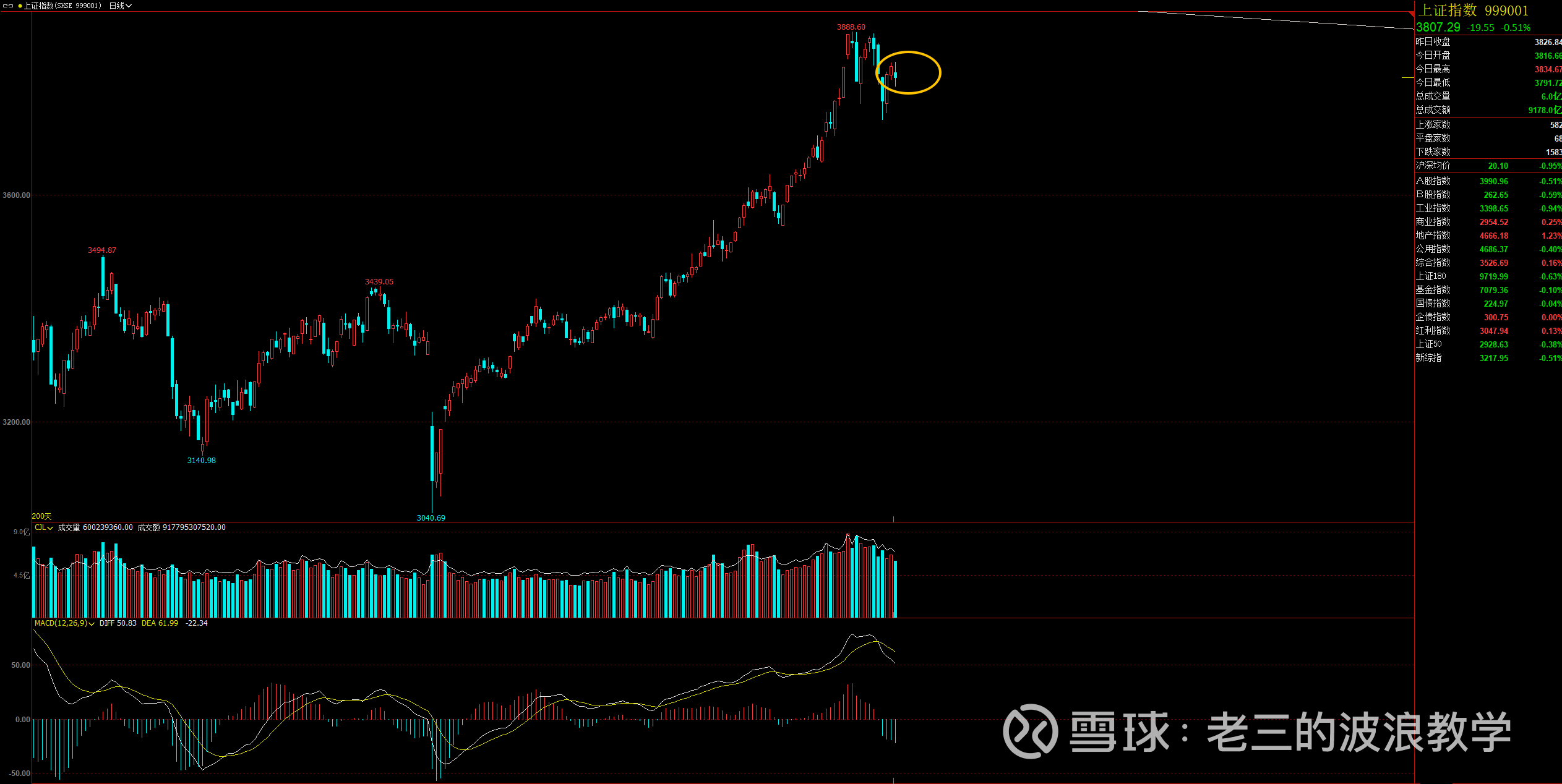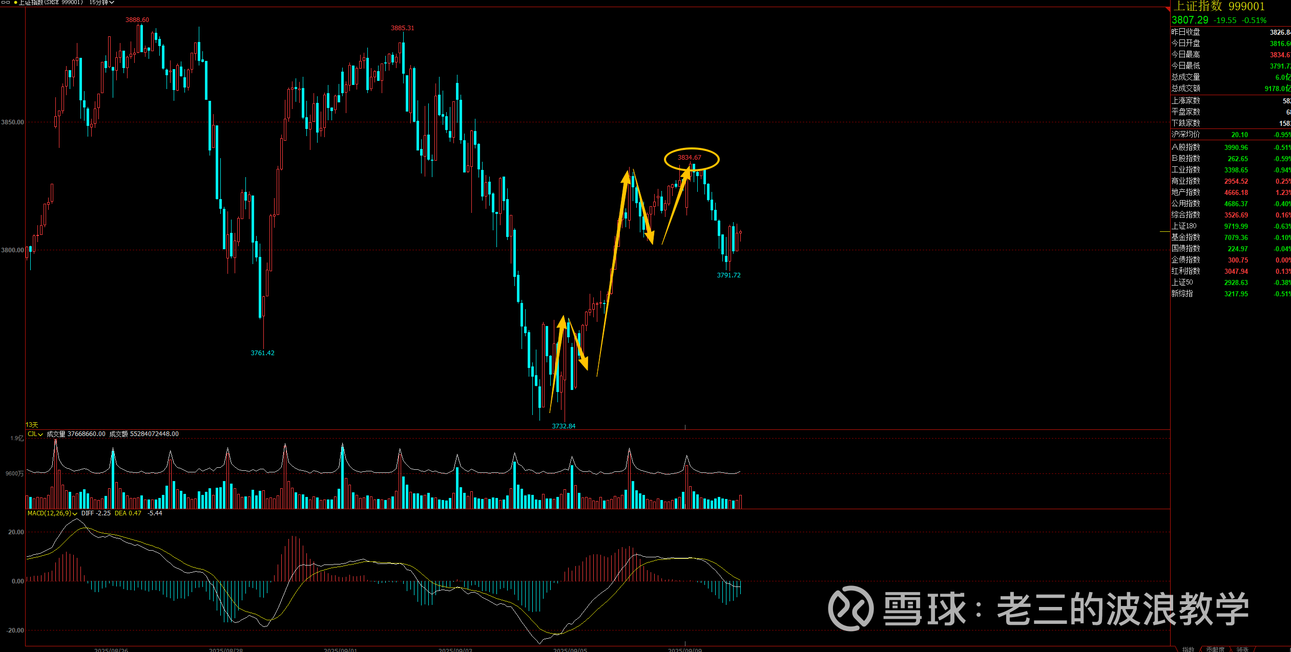 早盘低开后上冲,最高到3834后回落,从技术走势来说已经完成了3732以来的小五浪,所以随后回调也就不奇怪了。