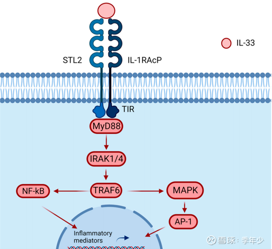 IL-33作为“警报素”家族成员,在肺部的上皮细胞和内皮细胞中表达。当肺组织损伤或感染时,IL-33迅速释放,在结合ST2L后,开展信号传导,激活下游通路。