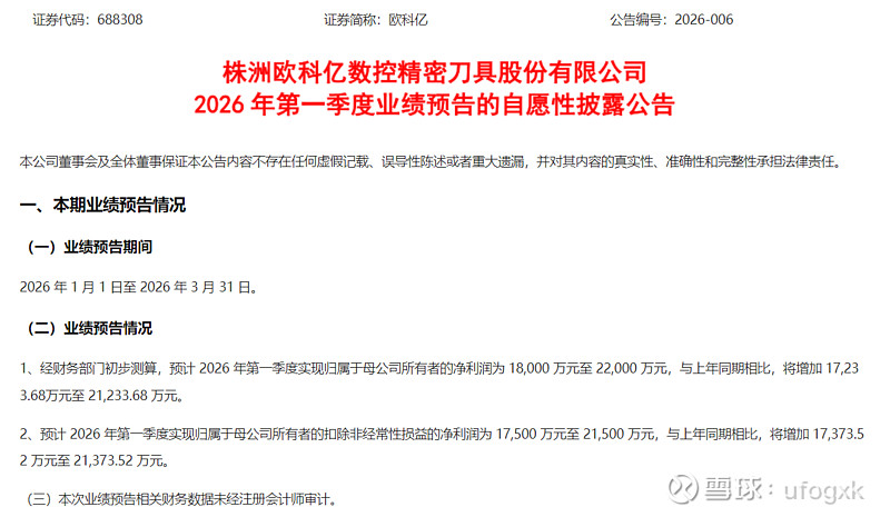 $欧科亿(SH688308)$ 优等生已经忍不住开始发业绩预告了,单季度业绩超去年全年一倍以上。原因公司讲的很清楚:硬质合金刀具的主要原材料碳化钨持续大幅上涨,公司具有资金优势和规模效应优势,实现产品量价齐升。2026 年一季度,公司数控刀片和数控刀具产业园项目产能利用率均持续提升,产品相应提价,毛利率和净利率同比提升,推动公司盈利能力提升。