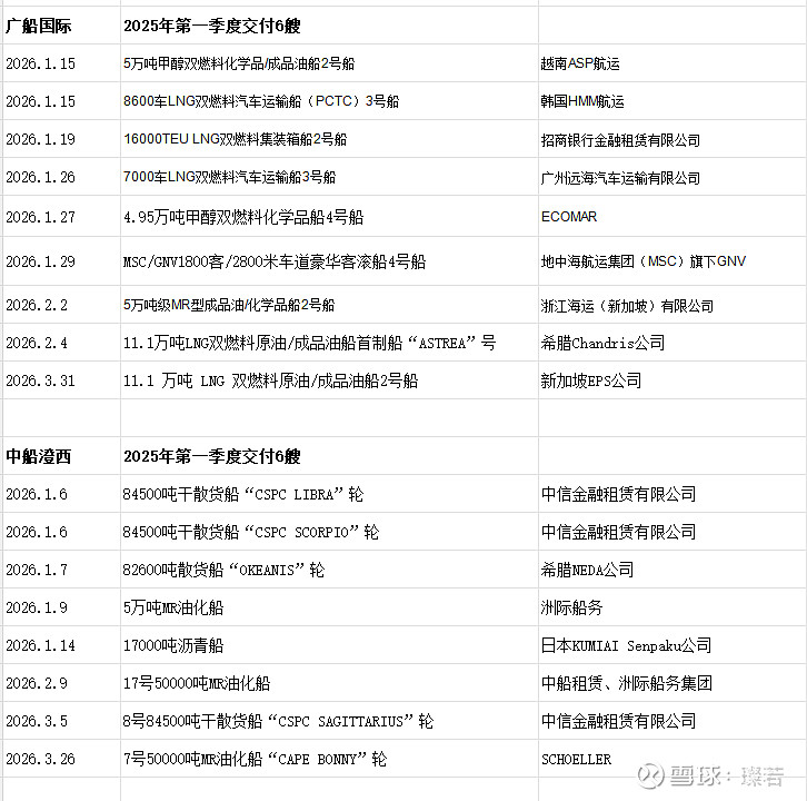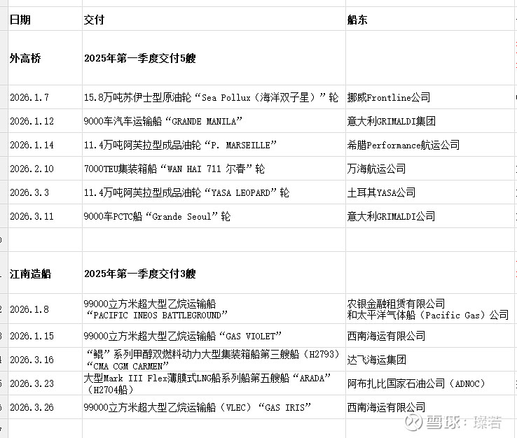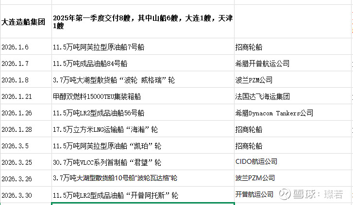 2026年一季度,外高桥、江南、广船国际、澄西、大连几个船厂合计交付了38艘船,比2025年一季度的28艘多交付了10艘,增量还是比较可观的,就看一季报能否同步释放出业绩了。$中国船舶(SH600150)$ $中国动力(SH600482)$ $中船防务(SH600685)$