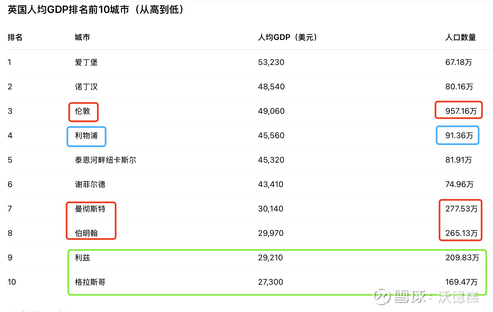 曼彻斯特和伯明翰的GDP位列第二和第三位,两座城市都是英国重要的工业中心,人口规模仅次于伦敦的大型城市