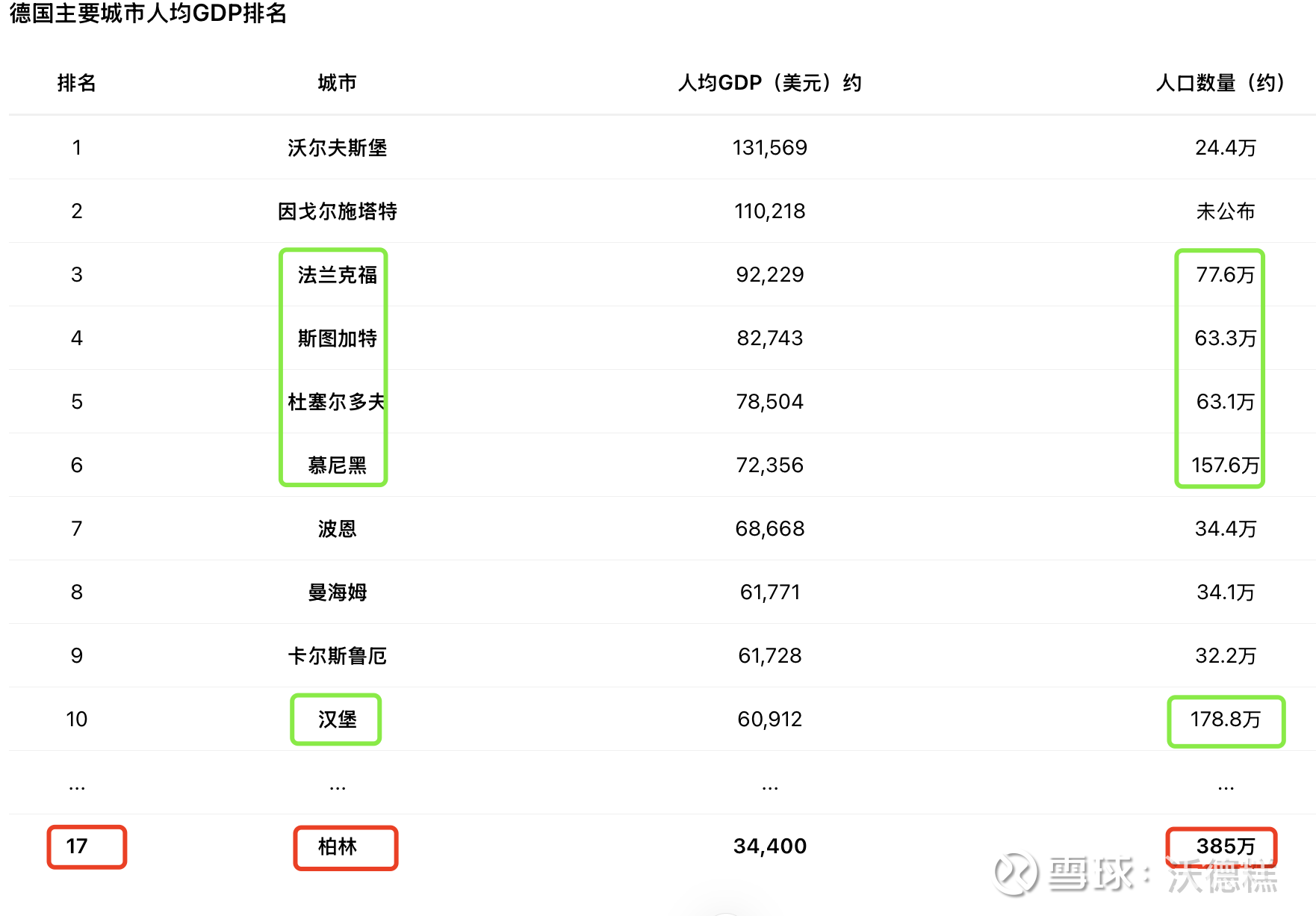 参考其他国家的城市人口,人口算多的城市有法兰克福、斯图加特、杜塞尔多夫、慕尼黑和汉堡,且他们的人均GDP都遥遥领先柏林
