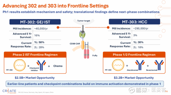 GPC3 是肝癌免疫治疗的理想靶点,该靶点在多数 HCC 病例中高表达,且在正常成人组织中不表达。此前 MT-303 在 Ⅰ/Ⅱ 期单药剂量递增试验中,已成功验证其可实现体内 CAR 表达、激活髓系细胞、促进肿瘤浸润,并具备临床活性和重复给药可行性,为其推进至联合治疗及早期治疗场景筑牢了基础。