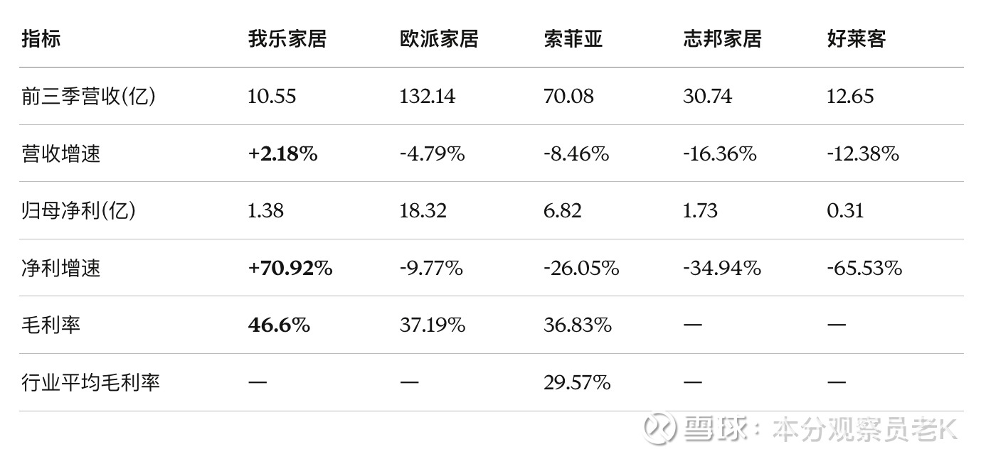 欧派毛利率37%,索菲亚37%左右,行业平均不到30%。我乐家居能做到46%以上,核心在于它坚持中高端定位,不参与低价内卷。这一点,老K是认可的——段永平说过,"性价比是给自己性能不好找的借口"。