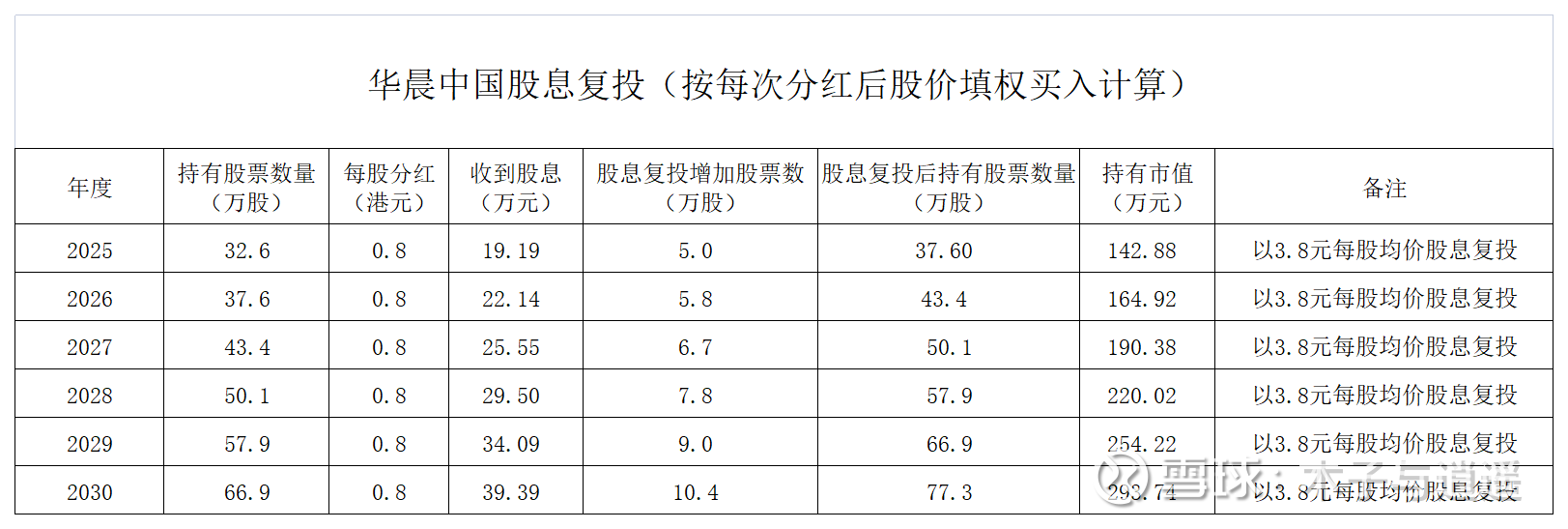 1.每次分红后股价填权推演:2025年持有的32.6万股,在收到每股0.8港元分红并扣除20%港股通税费后,复投买入后持有股票数量为37.6万股,对应持有市值142.88万元;以此推算,到2030年持有市值将达到293.74万元,年化收益率约15.5%。