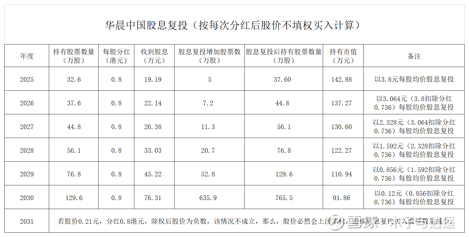 2.每次分红后股价不填权推演:从2025年持有的32.6万股,到2030年将达到765.5万股,持有市值从142.88万元降低到91.86万元,那么这种情况会发生吗?木子认为这种情况绝不会发生。在每年每股0.8港元分红前提条件下,若分红除权后股价不填权,到2031年,每股分红0.8港元,而股价只有0.21元,这种情况肯定会有很多资本进入,股价必然会上涨填权,与最初股价不填权的假设条件矛盾,因此,该情况不成立。
