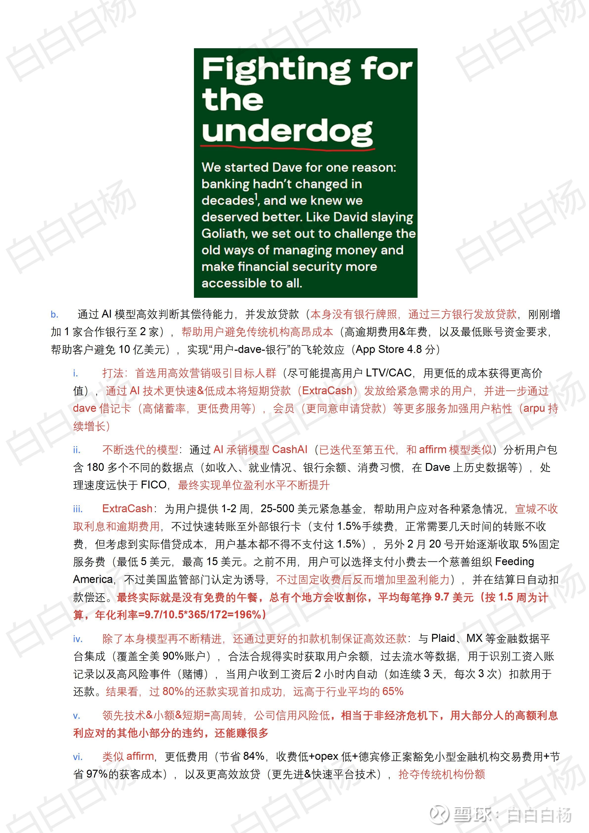 ii. 打法:首选用高效营销吸引用户,通过不断迭代的AI模型更高效放贷和扣款(单位盈利水平不断提升),还能帮助用户避免传统机构高昂成本,并进一步通过dave借记卡(高储蓄率,更低费用等),会员(更同意申请贷款)等更多服务加强用户粘性(实现arpu持续增长)