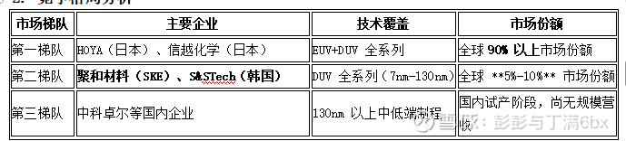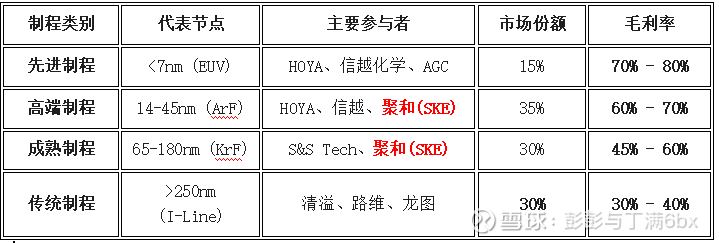1、空白掩膜基板 有极其强大的壁垒,全球核心玩家头部只有4家,第一梯队:日本HOYA/信越化学,两者能占到全球80%以上份额,垄断了EUV及高端DUV市场。第二梯队:就是韩国 S&S Tech、韩国 SK Enpulse(SKE,SK海力士内部孵化了8年,聚和材料要收购的)海力士原来是为了把SKE当做压降日本HOYA价格的三、四供(主要还有韩国 S&S Tech供货),亏损顶不住加上国内的自主可控需求及韩国总统新年访问国内,最终出售。
