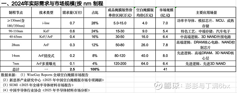 1)2024 年国内半导体空白掩膜版总需求约2.5万片,其中成熟制程(≥28nm)占比68%,先进制程(7-28nm)占比32%;