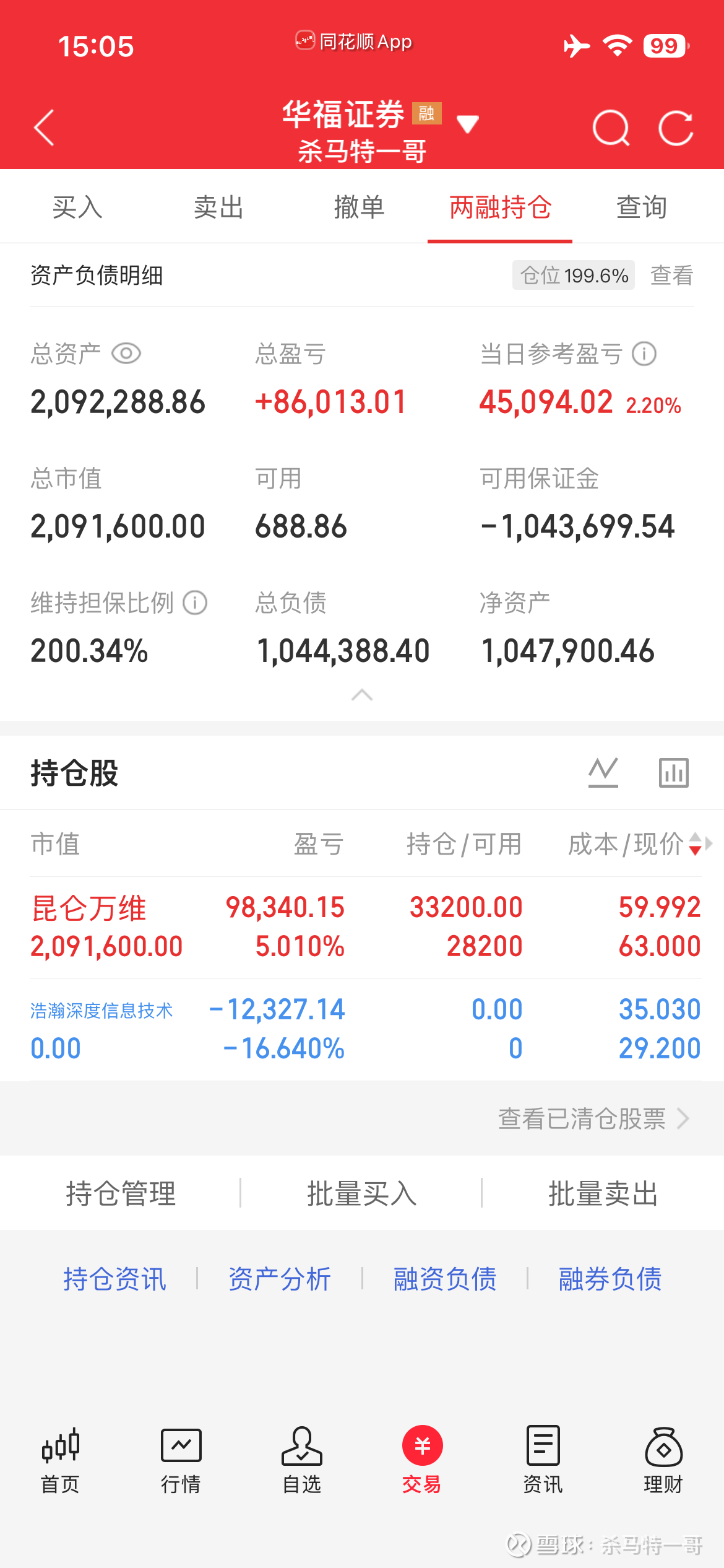 2月12日重仓买入昆仑,就是在博弈国产大模型的发酵,假期港股的两只ai大涨,预期能带动昆仑今天大幅高开,没想到受整个ai软件和算力影响大幅走弱。非常不幸运的是,受北美ai安全软件叙事的影响,今天浩瀚低开直接下杀,开盘是挂了卖单的可惜没有到成交价,一个犹豫就把之前赚的10个点左右的利润全部带走了。盘中昆仑还算比较抗跌,港股两小只又拉起来,我就在低位直接打满昆仑,博弈回流,比较好的是接近中午时资金开始回流昆仑,可惜整个板块情绪太差,单靠昆仑根本带不起来,明天又是左右为难的一天,头痛。俗话说得好,期望有多大失望就有多大,保持耐心把。最近整个人又开始焦虑起来了,作息颠倒,胃炎又隐隐约约犯了,导致精神状态很不好,阅读信息时很难集中注意力,只能看个大概,想赶紧赚点钱,去消费一波,靠外部的认可来抚慰内心,内心真的太煎熬了。$昆仑万维(SZ300418)$ $浩瀚深度(SH688292)$