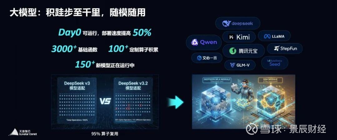 天数产品依托通用GPU丰富的指令集,以及过往7年在模型上积累的几千个基础算子库,为用户大模型开发及部署提供了国内最丰富的大模型乐高零件底座,使大多数模型发布即可跑通。调优仅需重建<2%的结构,新算子性能快速可调。具体的以DeepSeekV3到V3.2的升级为例,发布当天我们95%的算子已经支持,主要差别的Attion部分MLA到DSA的升级拆分后仅几个lib需要进行尺寸调优。