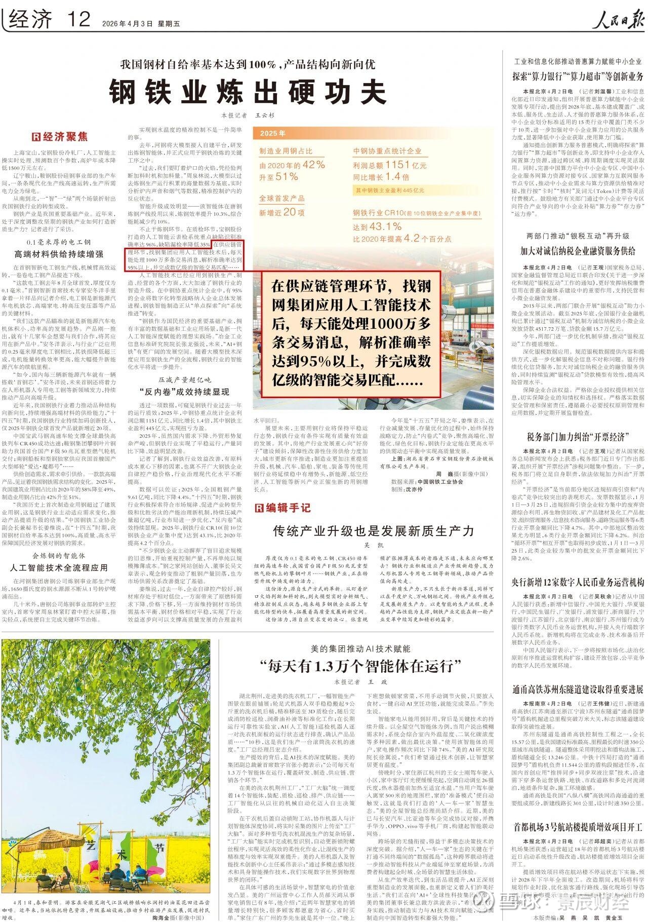 4月3日,人民日报经济版刊发《钢铁业炼出硬功夫》深度报道,聚焦我国钢铁行业在高端材料、人工智能应用和绿色低碳三大方向上的转型成效。找钢网集团作为产业互联网AI企业的代表案例,被重点报道。
