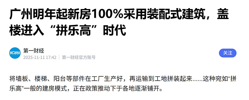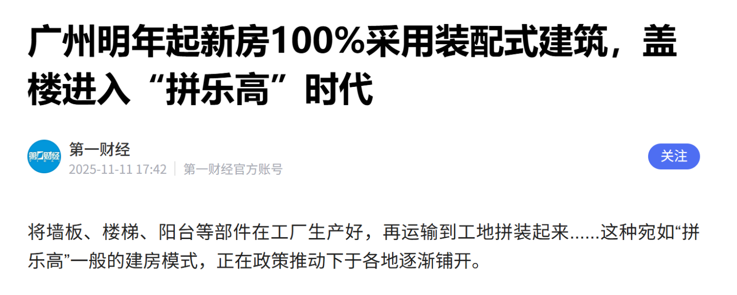 今天热点新闻里有一条值得关注的消息,广州2026年100%采用装配式建筑。