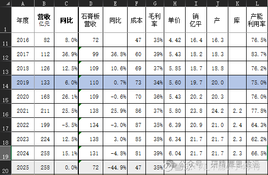 1、公司的历史很是辉煌,如果从2007年算起至2024年,这17年里,公司的营收增长了721%,净利润增长了1705%,折算成复合增长分别是13.2%和18.6%,算是一个历史上的超级成长股了(不代表未来)。公司过去的主营是石膏板,也是现在公司的主力产品,过去9年,石膏板的毛利率稳定在35%-39%,产品售价逐年提升。大部分时间公司都有产品的定价权,源于公司在行业中毫无争议的产能、成本优势和地域布局。2024年除外,这一年行业产能从49.5亿平猛增到58亿平,而且是在行业产能过剩的情况下,2024年公司在华北部分区域进行了久违的价格战。