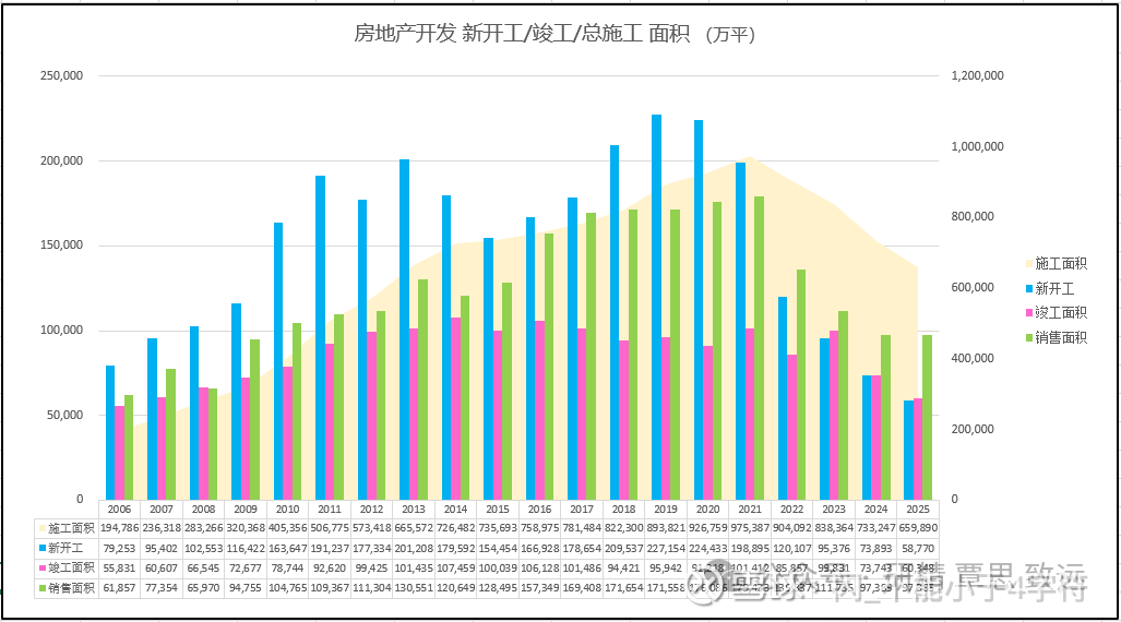 4、既然提到了建材,北新这个根红苗正的地产链企业,就不能不翻一翻房地产数据。图上的数据来源是国家统计局,不管准不准吧,至少口径是一样的,数据高些低些无所谓,简单看一个趋势。当年买保利的时候,预期未来稳态10亿平的年销量,倒是在2024年真的达到了,2025年这个数据奇迹般的一模一样,也是让我很意外。房价涨不涨不是我的菜,我也不关心。但即便是从新开工和竣工面积来看,销售面积下探的空间也不是很大了。叠加商业地产、二手房装修的需求,对于轻质建材、涂料这两个行业来说,底部区域基本上是看到了,防水可能还要等新开工面积的趋势走平。